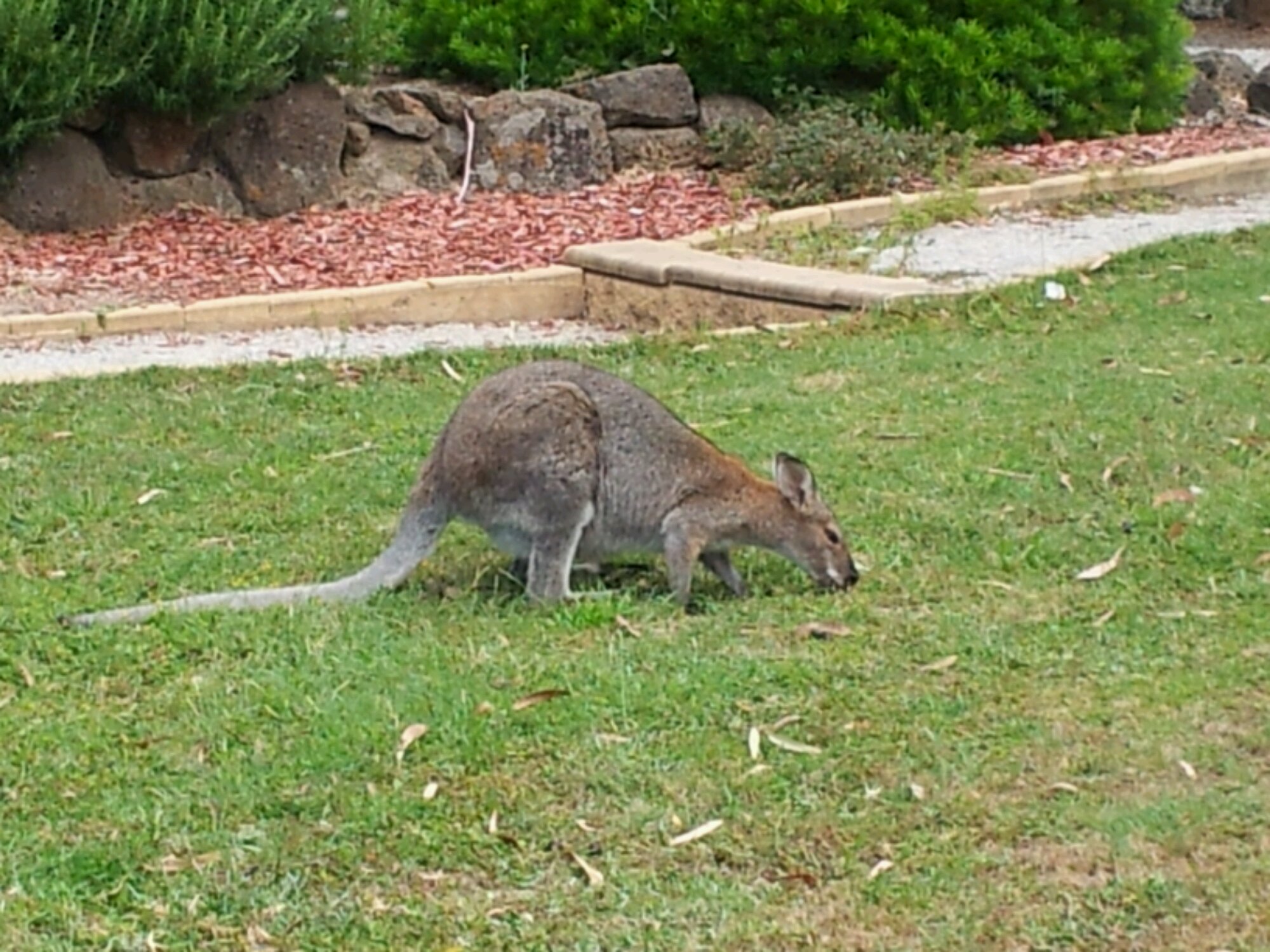 Die Grampians – ein kleiner Gebirgszug – erheben sich plötzlich aus dem flachen Land vor uns. Und wenig später erreichen wir unser Ziel, Halls Gap. Wir bleiben hier für drei Nächte und werden etwas wandern gehen. In unserer Bungalowsiedlung graßen die Kängurus direkt vor den Hütten.