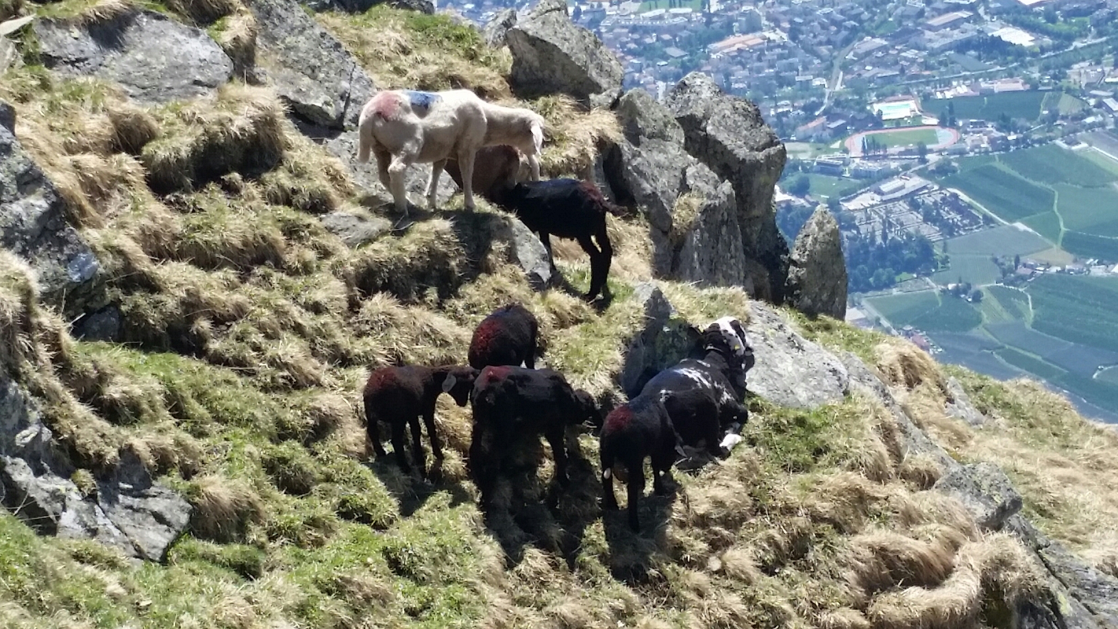 Plötzlich hören wir in unserer Nähe lautes Gemecker. Ich tippe auf die Ziegen, die wir im Oktober hier gesehen haben bzw. deren Nachfolger. Es sind jedoch Schafe mit vielen Lämmern, die hier oben das noch gelbe Gras fressen. Es brechen sicher bald bessere Zeiten an. Der Frühling kämpft sich sicher auch noch nach hier oben hin.