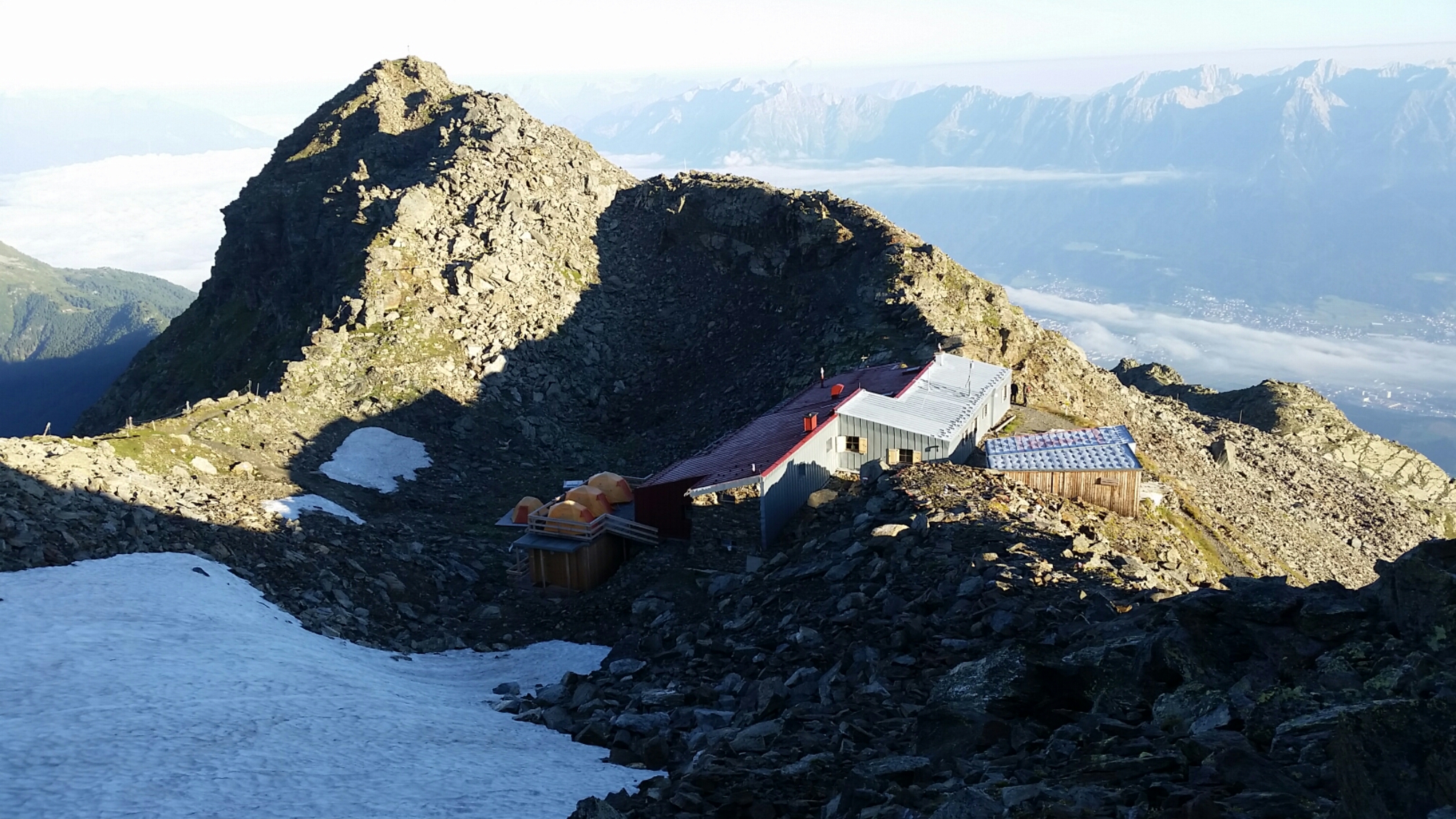 Ich bin die erste und es warten ein Viererzimmer und eine heiße Dusche auf mich. Nach und nach trudeln alle ein und die Gruppen finden sich recht schnell wieder zusammen. Nach einem kohlehydratreichem Abendessen, mit wunderbarer Pasta all arrabiata gibt es den Wetterbericht für morgen. Bis zum Tuxer Joch Haus dürften wir es vor den angekündigten Gewitter gut schaffen. Zumindest habe ich bei einem frühen Start die beiden exponiert liegenden Jöchl hinter mir. image