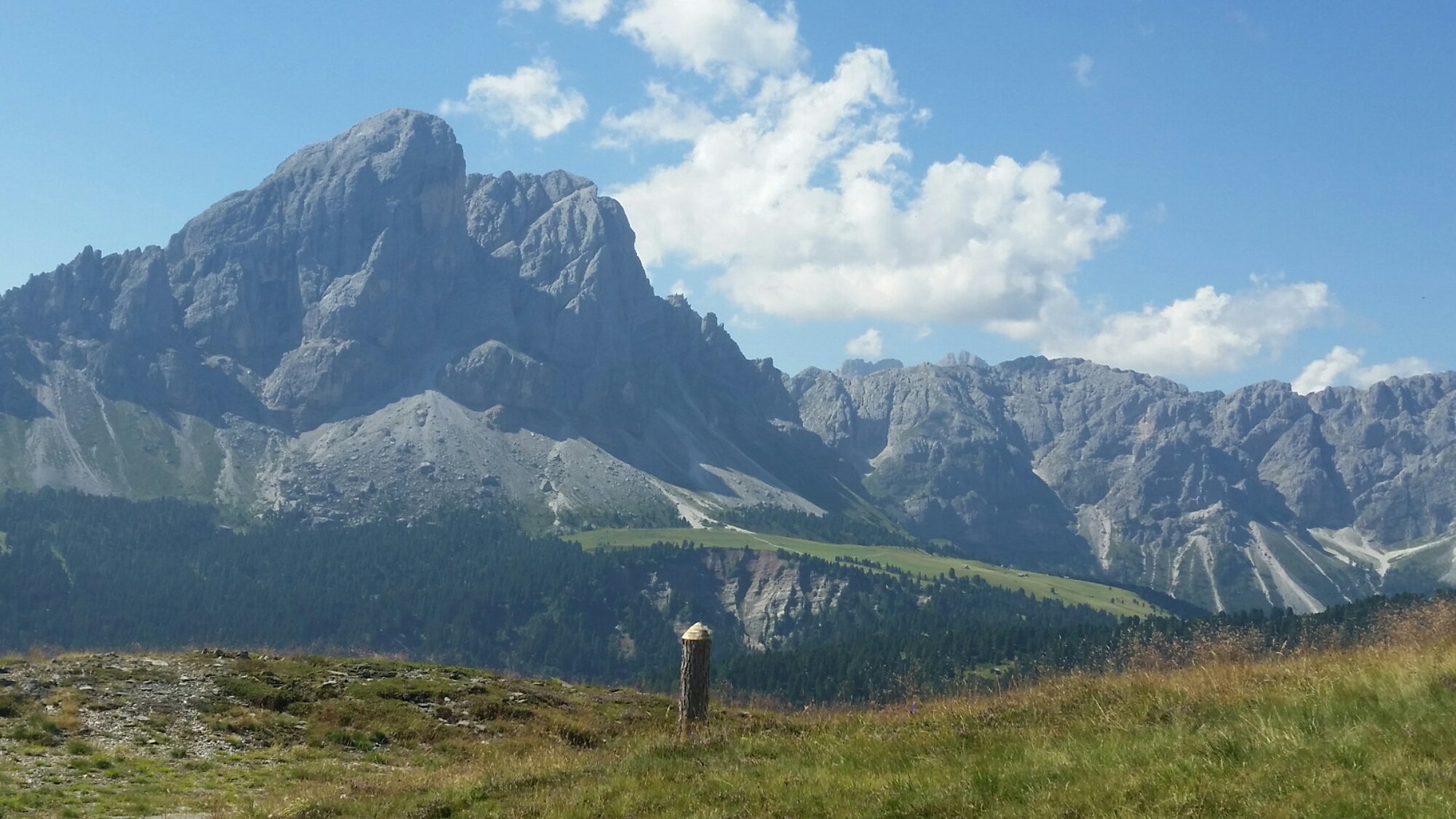 Von dort sind es nur noch nervige 70 Minuten bis zum Würzjoch, meiner Ausstiegstelle. Nervig deshalb, weil es 45 Minuten auf einem Fahrweg zur Passstraße bergab geht um dann auf der anderen Seite wiederum auf einem Fahrweg zum Würzjoch Haus aufzusteigen. Alle anderen gehen ab diesem Punkt in das Weltnaturerbe Dolomiten und übernachten nahe des Peitlerkofel, um dann ab morgen nur noch Dolomit unter den Füßen zu spüren.