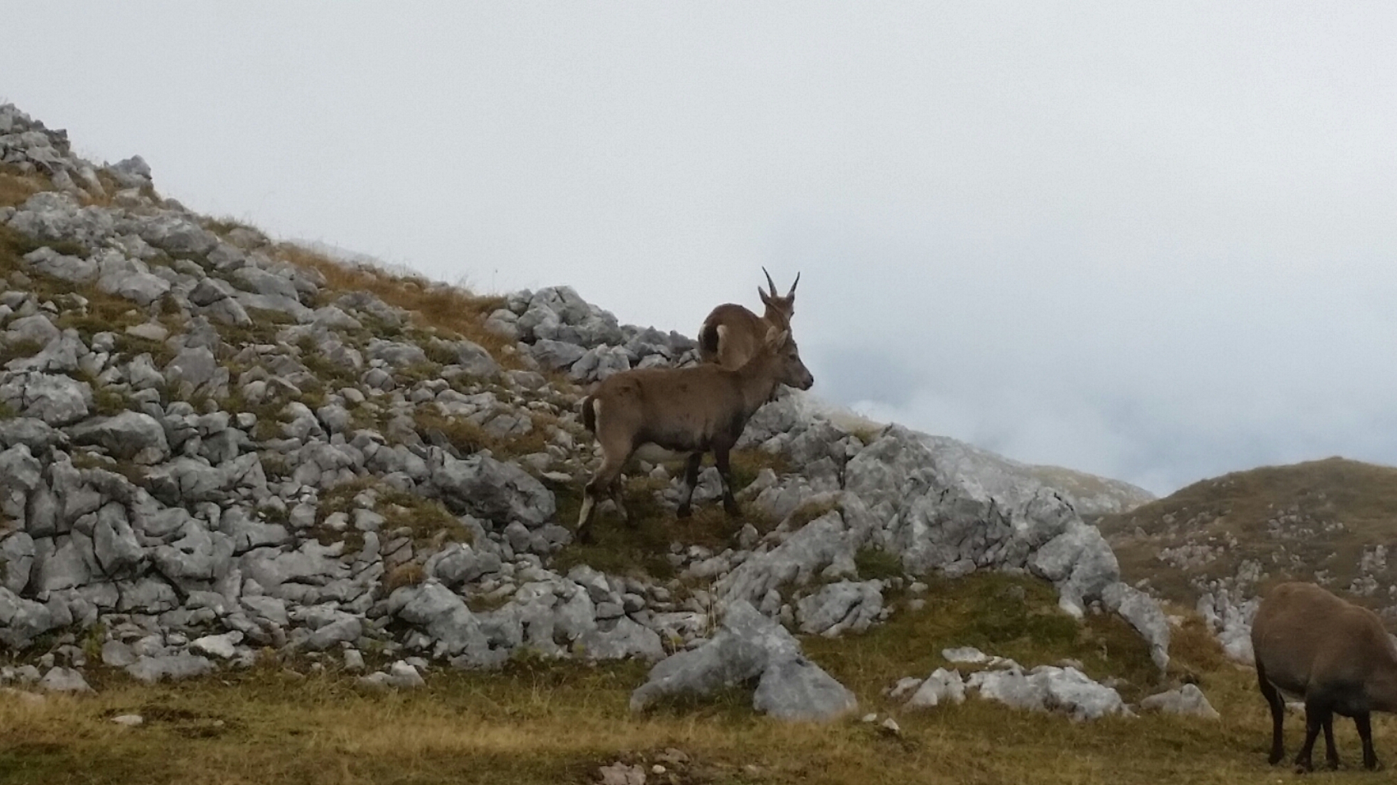 Es ist frisch hier oben, so dass wir schnell weiterziehen. Es geht in leichtem Auf und Ab auf der Höhe entlang. Plötzlich sehen wir Steinbockweibchen mit ihren Jungen – eine ganze Herde.