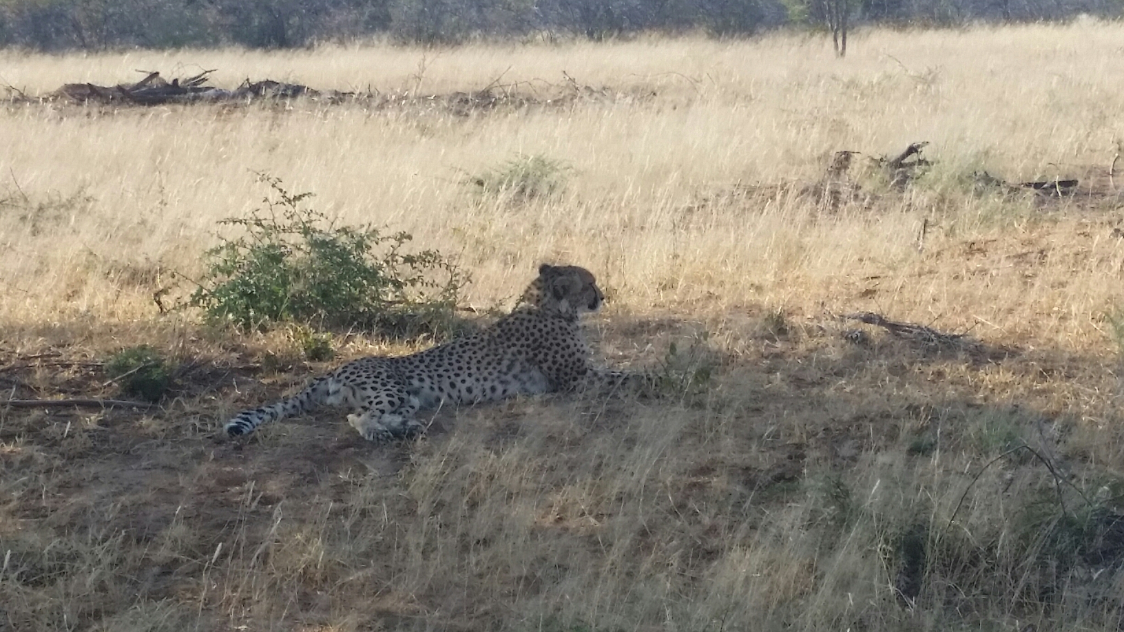 Wir haben aber Glück. Sie liegt direkt neben dem Weg unter einem Baum. Alle im.Jeep sind richtig glücklich. Da sie eine Cheetah ist, die von Menschen gefüttert wurde, kann sie auch ihre Nähe ertragen, obwohl sie diese nicht sucht. Bedeutet: Wir dürfen aussteigen und bis auf ca. 20 m an sie heran. Sie ist völlig unbeeindruckt und wir strahlen, trotz des etwas mulmigen Gefühls, wie Honigkuchenpferde. Es idt eine Cheetah, die mittlerweile völlig unabhängig von Menschen ist und allein überlebt. Das ist Wahnsinn und es gibt unzählige Fotos und trotzdem bleibt noch genügend Zeit die ausgiebig zu beobachten.