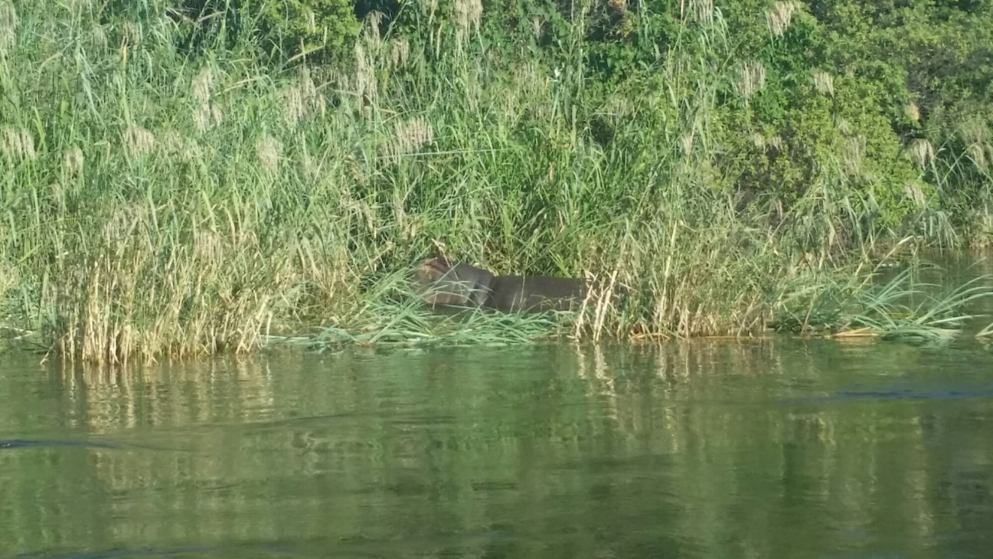 Schluss mit der Jammerei und Themawechsel. Nach einem langen Mittag, den wir auf der Terrasse verbracht haben, sind wir 16.00 Uhr mit zwei weiteren Paaren und unserem Guide John zur Flußsafari auf dem Okavango gestartet. Mal sehen, was wir sehen. Er sagt uns, dass wir am Flussufer nach Rocks with ears Ausschau halten sollen oder auch nach beweglichen Steinen. Es geht erst flussabwärts und nicht weit von der Lodge sehen wir tatsächlich eine Gruppe Hippos im Wasser. Es ist faszinierend, ihn zuzuschauen und ja, es schaut aus, wie Felsen mit Ohren. Sie können ja bis zu fünf Minuten unter Wasser sein und dann auf dem Grund herumlaufen.