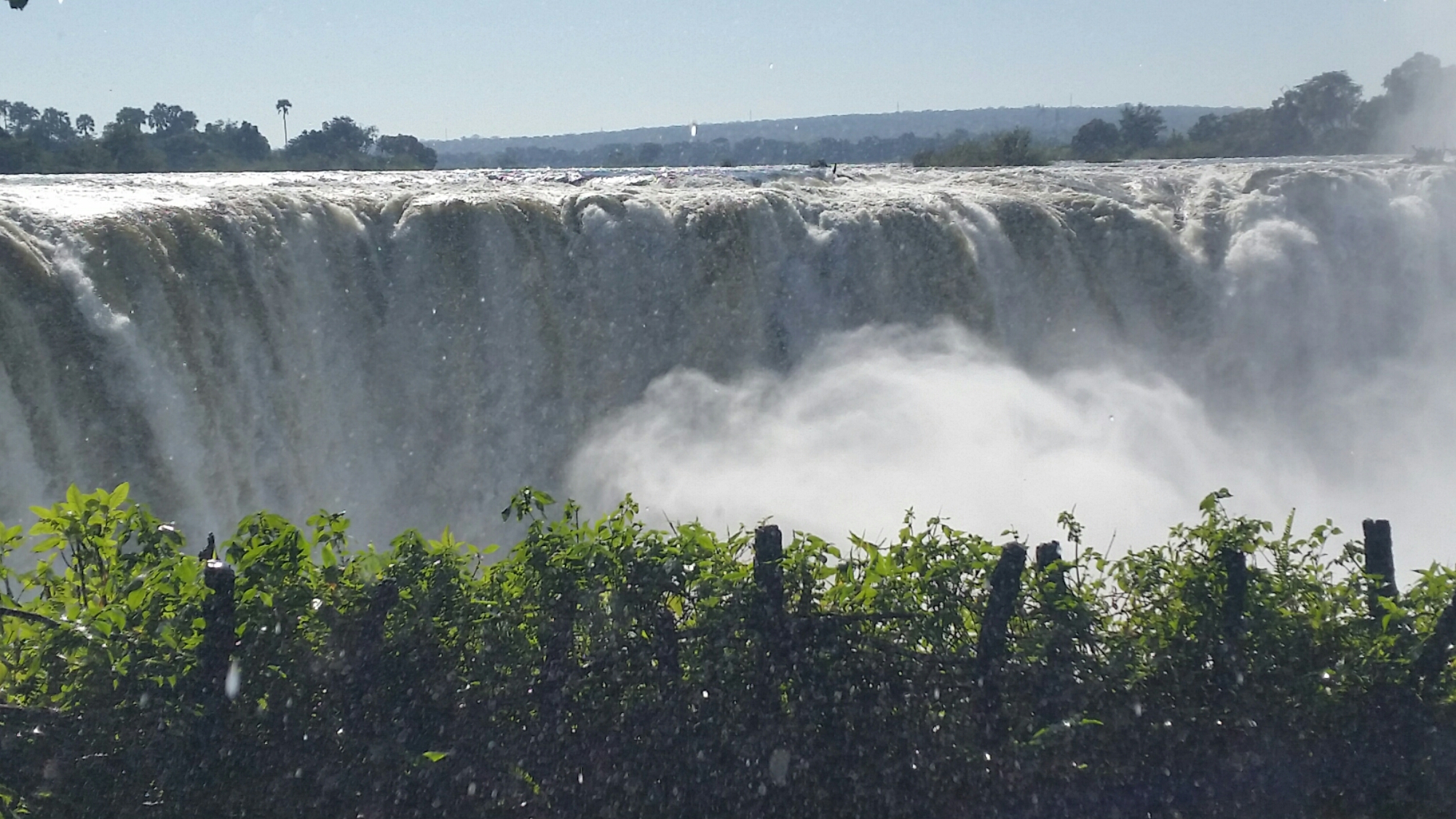 Nach einer Stunde Fahrt sind wir in Victoria Falls angekommen und dürfen nach weiteren 30 USD in den Park. Es rauscht, donnert und regnet bereits, trotz blauen Himmels. Mit Capes bewaffnet geht es los.