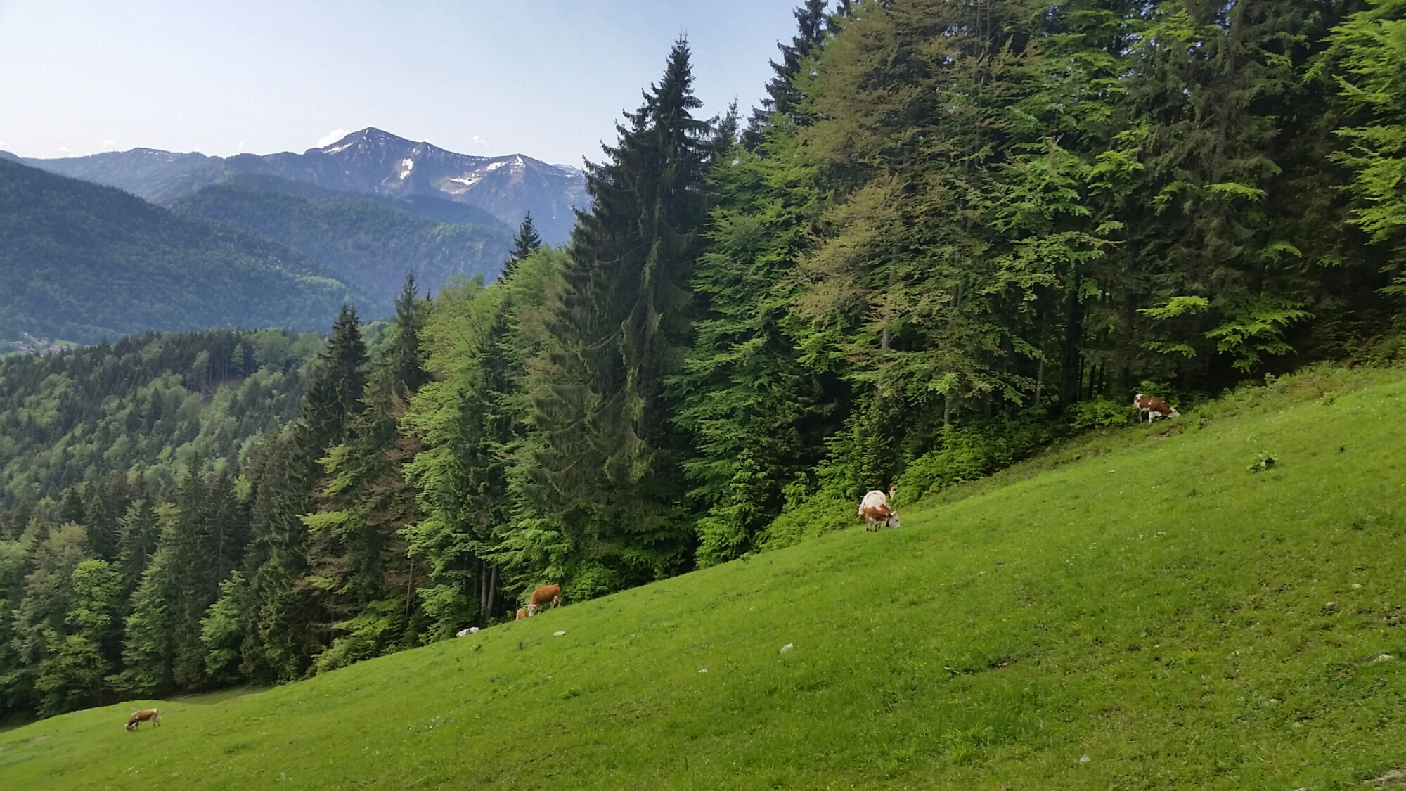 Durch das noch frische Maigrün laufen wir in Serpentinen zur Rauhalm. Ab dort öffnet sich der Blick in Richtung Blauberge und Karwendel im Süden und gen Norden schaut der Tegernsee hervor. Wir sind dankbar, dass wir soviel Schönheit vor der Haustür haben und dies bei schönem Wetter immer und immerwieder haben können – mit etwas Anstrengung natürlich.