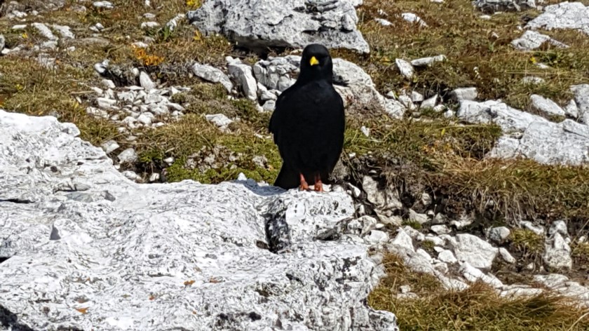 Zum Glück habe ich gestern Abend mal auf der Homepage der Hütte nach den Öffnungszeiten geschaut. Sonntag, 25. September war der letzte Tag. Eine weise Eingebung, sonst hätte es böse ausgehen können. So packen wir an einem Dolomit-Tisch unsere Brotzeit aus und können sofort futtern -Vinschgerl, Speck und leckeren Käse aus der Sextener Käserei. Wir haben einige neidische Gäste, die wir jedoch gut in Schach halten können.