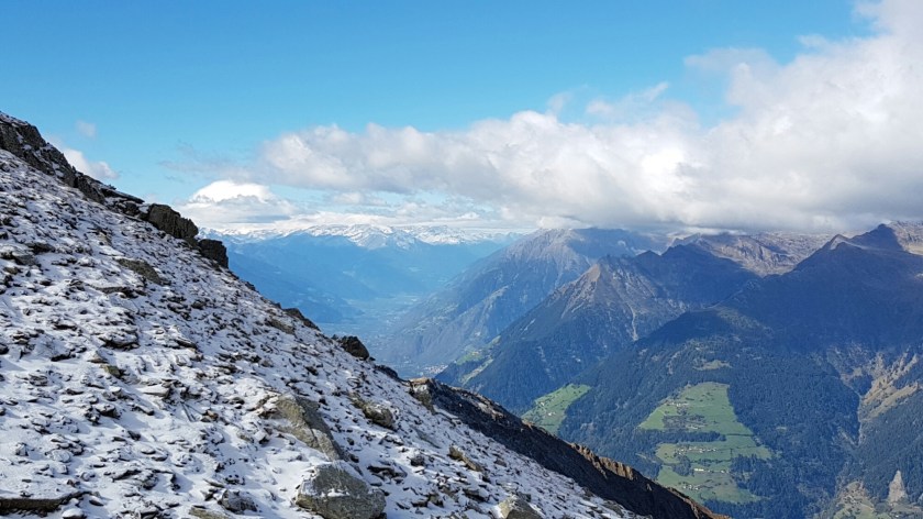 Es ist ziemlich frisch hier oben und es pfeift ein ordentlicher Wind. Mit etwas Abstand zu einigen Wanderern vor uns (wahrscheinlich aus der vorherigen Gondel) machen wir uns auf den Weg. Es lässt sich gut gehen und dann schon bald blicken wir auf Hirzer Hütte und Tallner Alm von oben herunter. Aus ein paar Eiskristallen auf dem Gras wird mehr und mehr eine Schneedecke. Es lässt sich dennoch gut gehen, wenn nur die Eiseskälte durch den Wind nicht wäre. Wir schwitzen nicht einmal ansatzweise und das kalte Wasser aus dem Rucksack empfinden wir als lauwarm. Es wird im.er mehr Schnee, je weiter wir vorankommen und die langsam beginnt auch der Weg anspruchsvoller zu werden. Wir brauchen die Hände und kraxeln uns Meter für Meter nach oben. Die Frage ist, wie es abwärts geht. Auf der oberen Scharte auf 2.678 m angekommen, eröffnet sich bereits ein phantastischer Rundblick – Vinschgau, Dolomiten, Texelgruppe…und der Wind der pfeift:-) Wir blicken auf den Hirzer Gipfel, dessen Gipfelkreuz wir schon gelegentlich am Anstieg gesehen haben.