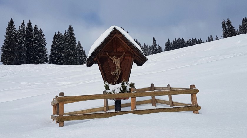 Also packen wir unseren Rucksack und starten von der Haustür weg erneut zu einer Winterwanderung. Von unserem „Hausberg“ geht es hinab ins Tal und gleich auf den Wanderweg. Heute ist die Loipe frisch gespurt und auch der Wanderweg ist geräumt. An der Zwölfer-Nordbahn wechseln wir auf dem Panoramaweg die Seite, um wenig später in eine Bergstraße einzubiegen. Zur Rosswaldhütte sind es von hier aus 90 Minuten (im Sommer). Im Schnee dürfte es etwas länger dauern. Wir laufen durch einige versprenkelt liegende Höfe und bekommen mit jedem Schritt einen besseren Überblick über das Tal. Bald zweigt ein wirklich schöner Wanderweg/Forstweg ab, der gut geräumt ist und zügiges Gehen ermöglicht.