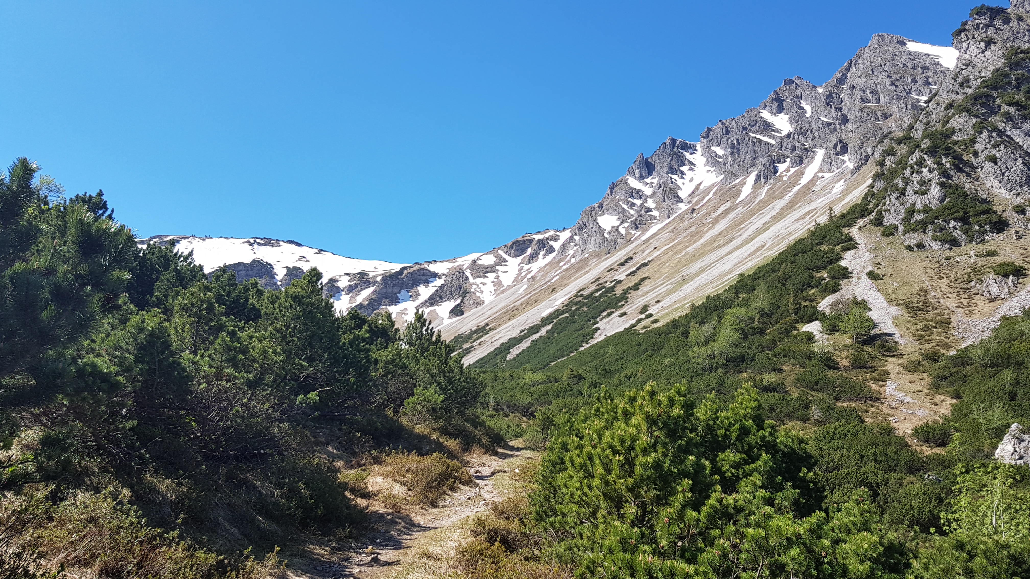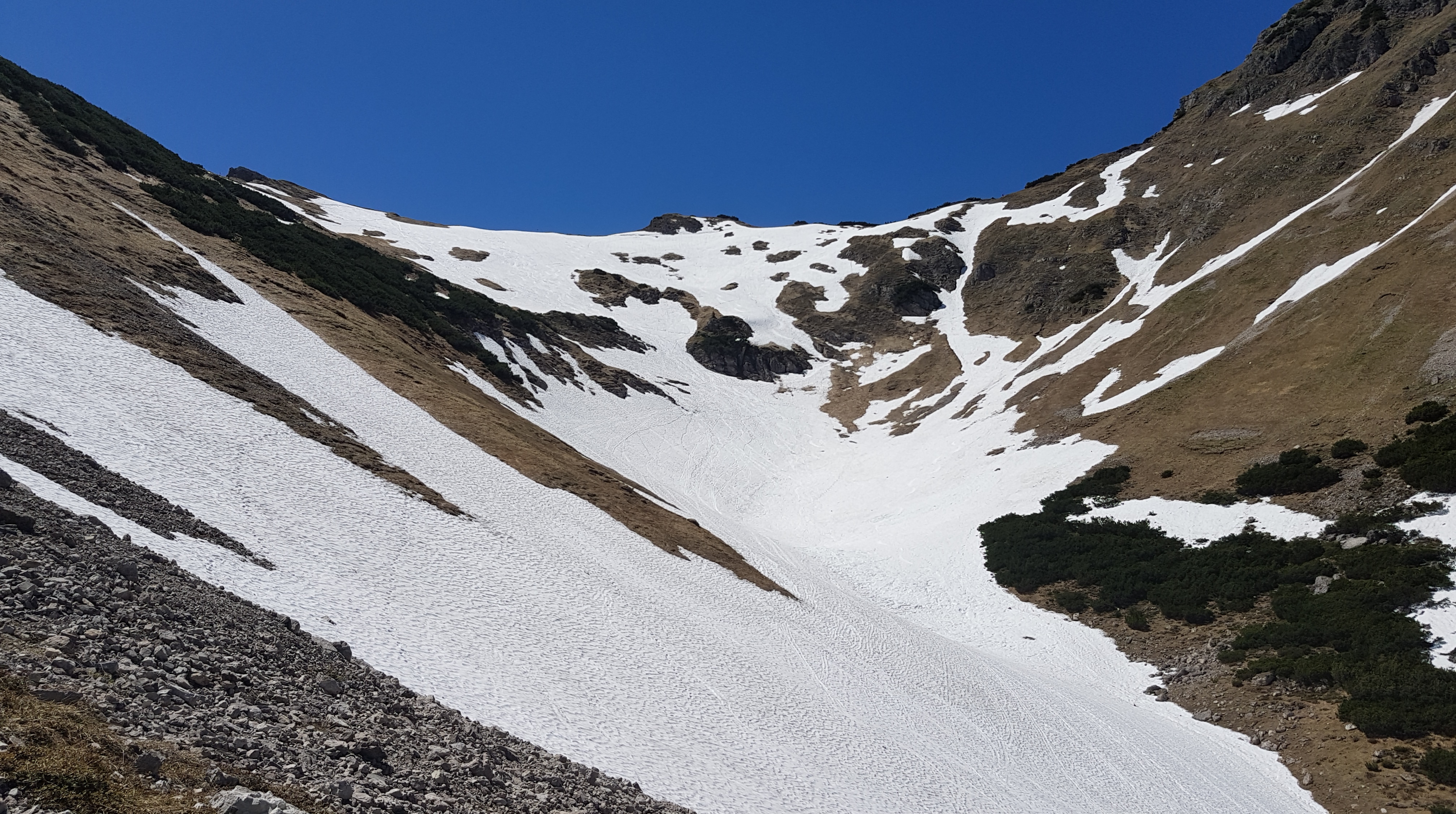 Wir schaffen es und laufen auf schattigen Pfaden durch den Wald. Bald öffnet es sich und wir sehen den Bergrücken des Zirlesecks und rechts das Gipfelkreuz des Ponten. Jetzt geht es durch Latschen und über Almrosenwiesen. Die Sonne brennt schon ziemlich und wir sind froh, dass wir verhältnismäßig früh gestartet sind. Auf dem Pfad, der auf dem Bild zu erkennen ist, sind wir vergleichsweise mühelos aufgestiegen. Aber ja, wir befinden uns auf der Nordseite und der letzte Schneefall war reichlich und ist noch nicht so lange her. Daher erwischt es uns auch und wir müssen uns den Weg selbst spuren. Der Schnee ist weich, dennoch fest genug, dass er Halt gibt. Der Bergrücken des Zirlesecks ist zu erkennen und auch der Schnee auf dem Weg dahin 🙂