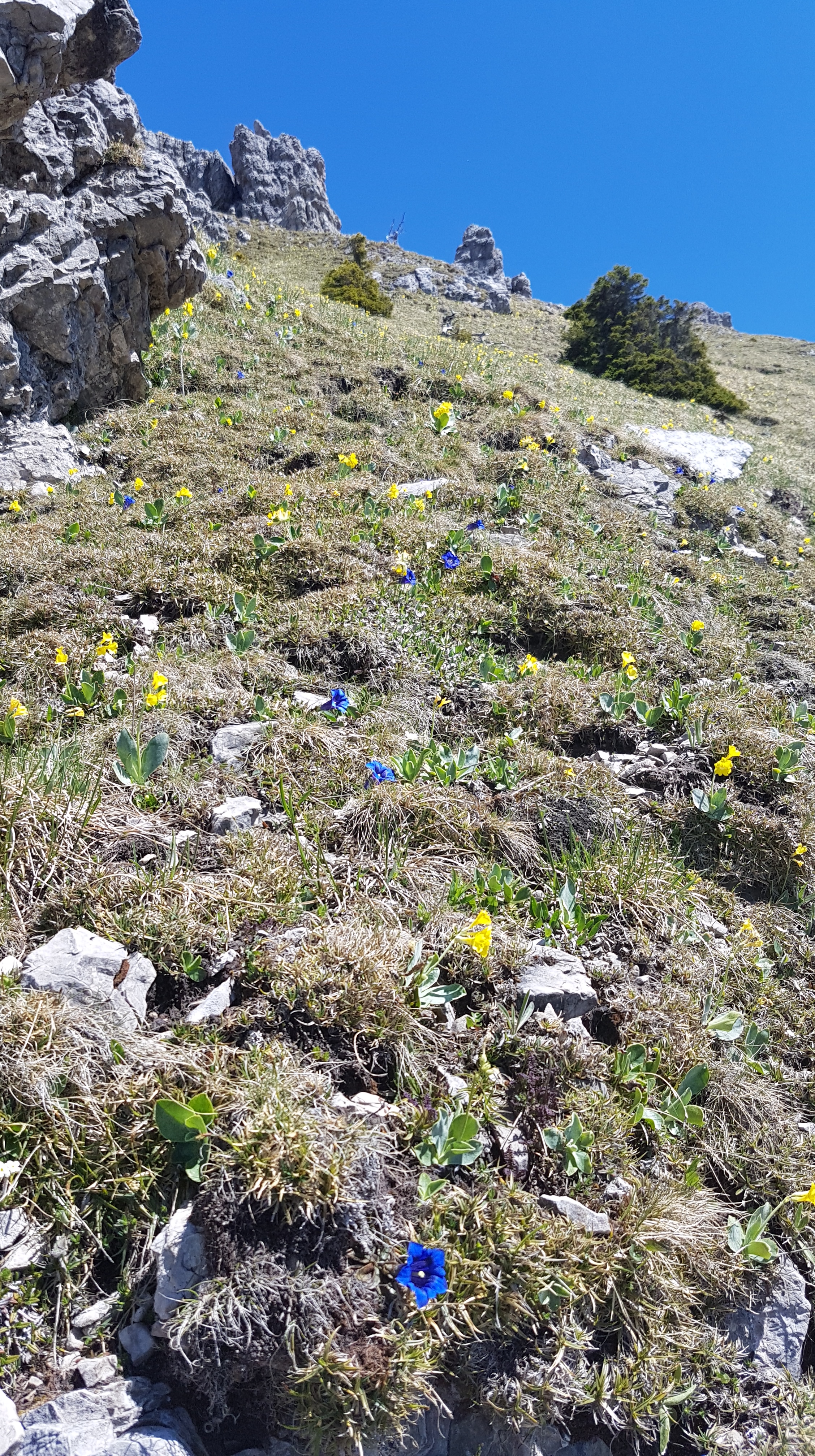 Bald sind wir auf 1.872 m auf dem Zirleseck und nach Süden tut sich ein phantastischer Blick auf. Als erstes sehen wir einen alten Bekannten, das Gaishorn. Das haben wir in einer Hitzeschlacht im September 2012 bestiegen und es ist eigentlich eine Wiederhohlung wert. Von hier oben sehen wir viele Bekannte, die wir schon erklommen haben – Aggenstein, Rote Flüh… wenn der Schnee nicht das Sitzen erschweren würde, könnten wir hier noch etwas bleiben. Doch der Gipfel lockt. Über den Bergrücken hinweg in westlicher Richtung haben wir in kurzer Zeit den Gipfel. Die letzten Höhenmeter führt der Weg durch wunderbar blühende Wiesen und hier oben bekommt man noch die zweite Bergreihe dazu. Mit ein paar Wanderern teilen wir uns den Gipfel. Die brennende Sonne lässt uns nur kurz verweilen.