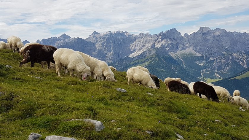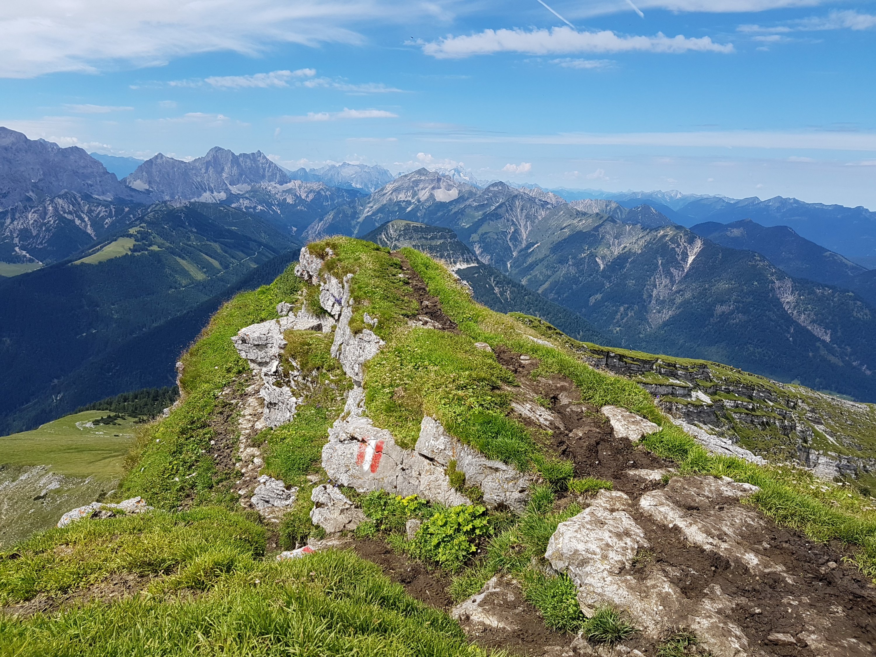 Nach der Moosenalm kommen wir auch aus dem Wald heraus und beginnen durch Latschen zu wandern. An einer Weggabelung können wir die etwas weniger anstrengende Route zur Tölzer Hütte wählen, was in Anbetracht unserer müden Knochen wirklich eine Option gewesen wäre. Aber nein, wir nehmen den Gipfel des Schafreuter ins Visier. Langsam bekommen wir erste Ausblicke, die heute wirklich ganz klar sind. Die Luft ist rein gewaschen. Wir allerdings müssen unsere Augen auf dem Weg halten. Es ist total glitschig, durch die Regentage in der letzten Woche. Jeder Schritt muss mit Bedacht gesetzt werden, vor allem, wenn es links oder rechts oder auf beiden Seiten ziemlich steil abfällt. Die Motivation ist im Keller. Warum musste es unbedingt der Gipfel sein? Der Verstand meint, dass es perfektes Training für den Pfunderer Höhenweg ist. Der Bauch hingegen hält es für eine absolut unnötige Ausweitung der Tour.