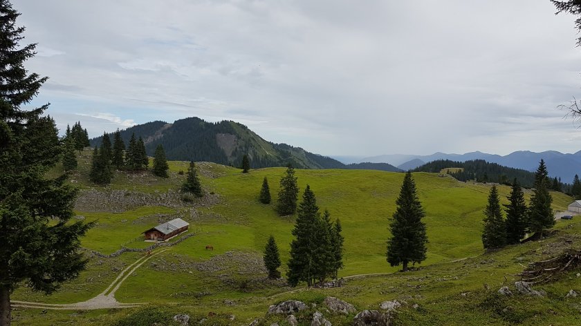 20 Minuten vor 9.00 Uhr geht es Nähe der Oswaldhütte (884 m), ca. 3 km hinter Vorderriss los. Der Himmel ist bewölkt, also dunkel bewölkt. Egal, es ist Sonne und Hitze vorhergesagt. Auf einem breiten Forstweg steigen wir Kehre um Kehre relativ steil bergan. Bald meldet sich der Hunger und wir haben ein schnelles Frühstück im Stehen. Das ist besser, als morgens um 6.00 Uhr zu essen. Jetzt geht es leichter, wobei heute leichter nicht zwingend leicht bedeutet. Wir waren gestern Abend kurzerhand noch 10 km joggen und die stecken uns doch etwas in den Knochen. Das bedeutet heute, dass wir bis zu unserem ersten Etappenpunkt, der Moosenalm, auch die angeschriebene Gehzeit brauchen, wobei die immer noch eine Stunde kürzer ist, als im Wanderführer. Die Moosenalm ist eine wunderschön gelegene Hochalm, mit vielen jungen Kühen und Pferden, die ein riesiges Areal für sich haben.
