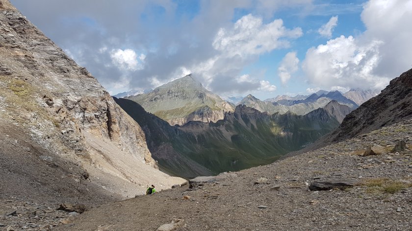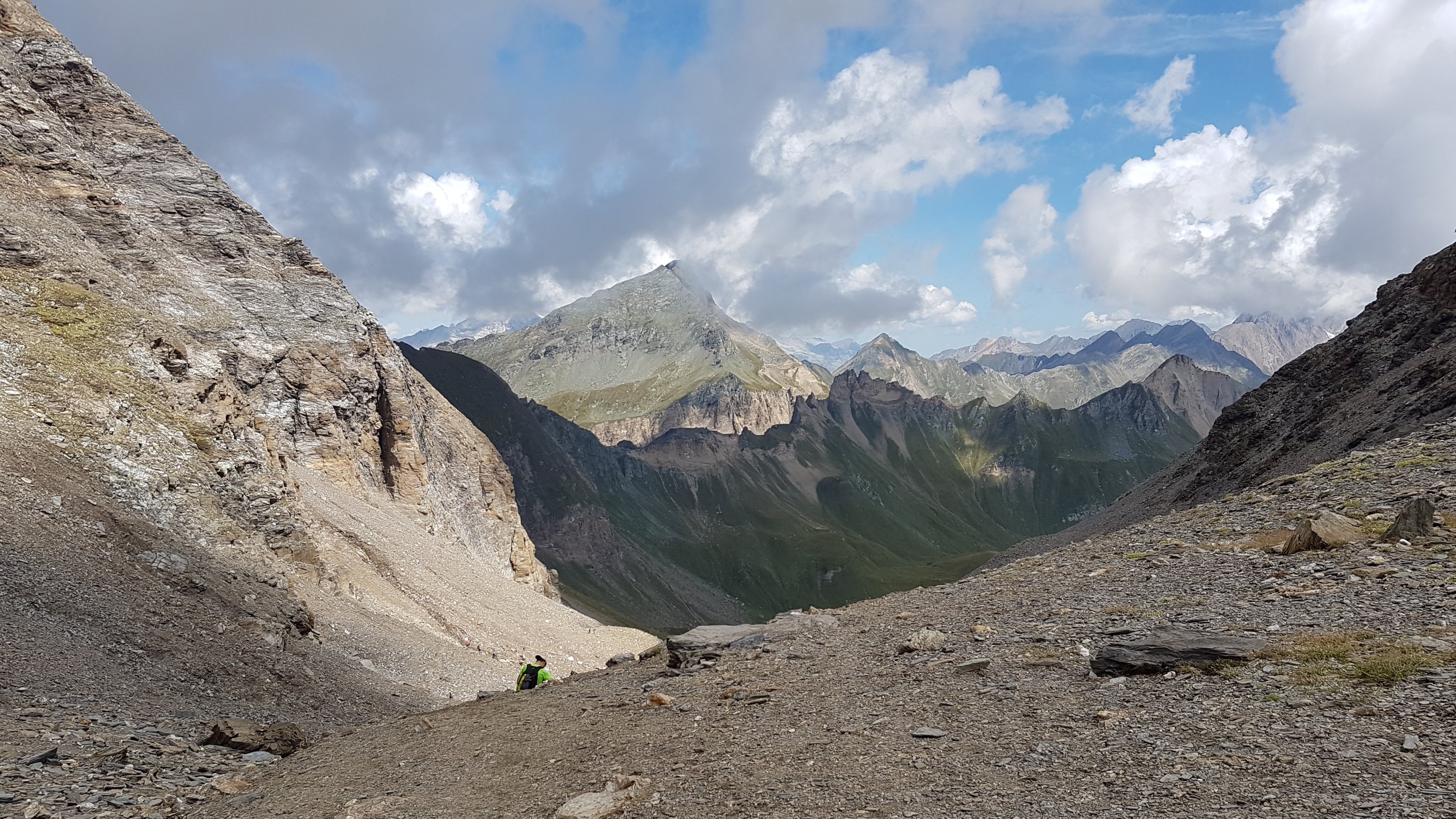 Endlich können wir befreit weiter laufen und die Tour steht auch nicht kurz vor dem Abbruch. Der Weg zum Rauhtaljoch zieht sich ordentlich nach oben. Es ist fast wie Treppen steigen. Wir könnten am Joch zur Wilden Kreuzspitze aufsteigen und so einen 3.000er mitnehmen. Aber so richtig Lust kommt trotz der nur 200 hm nicht auf. Also steigen wir die 500 m hinab zur Brixner Hütte. Auch abwärts kann es sich ziehen. Schotter und rutschiger Untergrund erfordern Achtsamkeit und der Rucksack schiebt mit seinem Gewicht ordentlich.