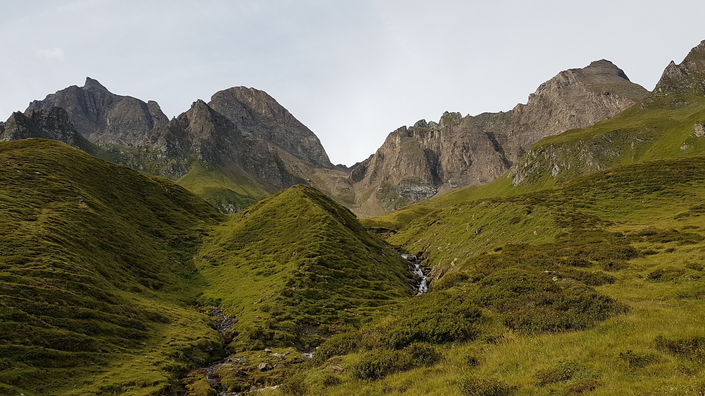 Schlag 6.30 sitzen wir beim Frühstück und es gibt wieder dieses wunderbare Pfunderer Brot, das wie Vinschgerl schmeckt. Davon kaufen wir uns noch ein paar Scheiben als Proviant. Das Wetter sieht nicht überzeugend aus. Dicke, dunkle Wolken ziehen über die Gipfel. Da ist guter Rat teuer. Wir warten vor der Hütte noch etwas und plötzlich stehen wir mitten in einem Regenschauer. Nach 20 Minuten wird es heller und wir starten. Die Prognose ist nicht so günstig, so dass wir sehr wahrscheinlich ab- und wieder aufsteigen.