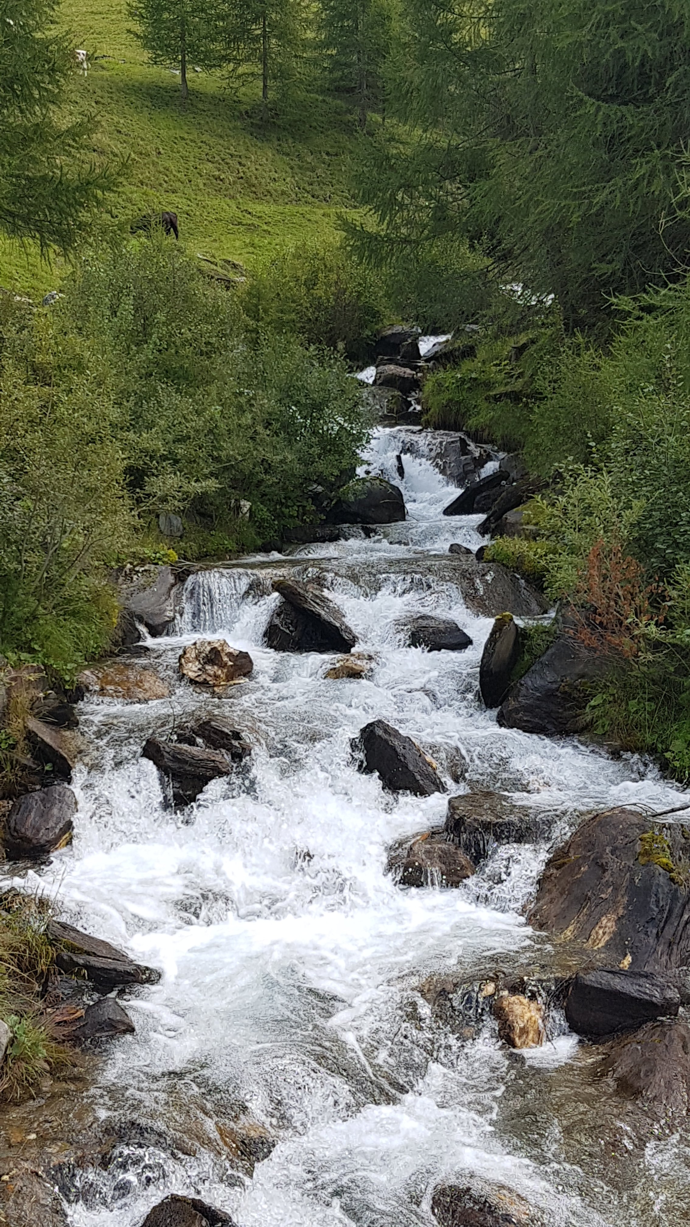 Zur Edelrauthütte dürfen wir jetzt noch einmal 1.100 hm unter die Füße nehmen. Die Sonne sticht und es fällt uns nicht leicht, der Bodenalm, wenige Minuten nach Dun zu widerstehen. Tun wir aber! Serpentine um Serpentine winden wir uns den Pfunder-Almenweg nach oben. Hinter fast jeder Kurve erwartet uns eine Kuh. Die haben hier allen Platz der Welt und genießen das Angebot.