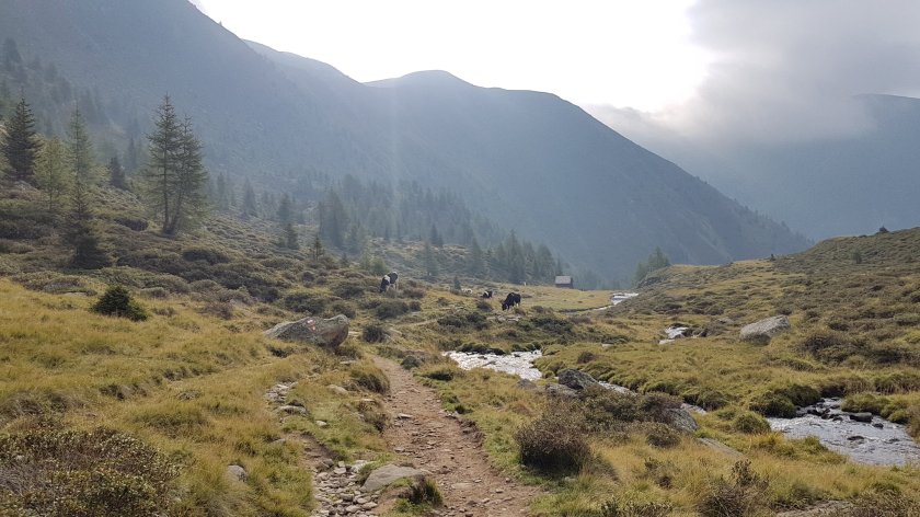 Die Wolken hängen tief heute, aber es ist trocken, so dass wir nach unserem gemütlichen Frühstück den Abstieg antreten. An der Hütte gibt es ziemlich Aufregung. Es ist gerade eine Kuh abgestürzt. Der Hüttenwirt rennt zur Hilfe. Wir sehen sie nicht, aber die Stimmung ist doch gleich etwas getrübt.