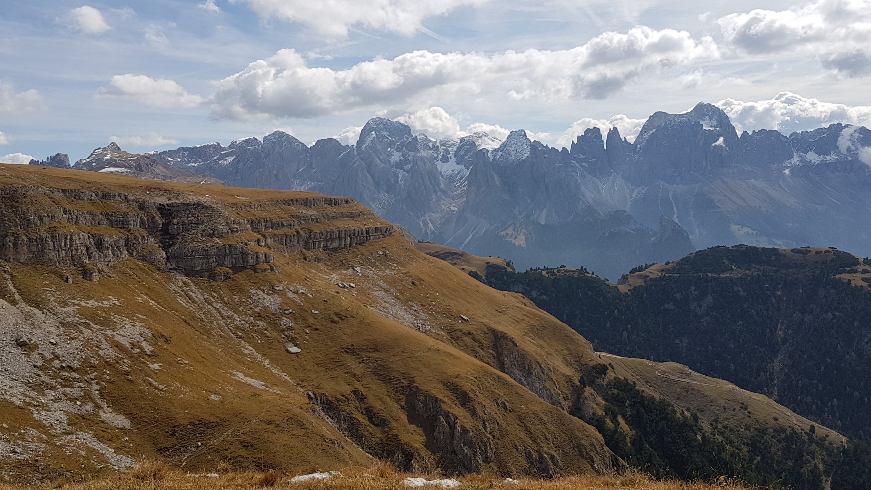 Der Schäufelesteig (ich muss da immer an den Braten denken…) ist als ziemlich steil beschrieben und es stimmt. Die nächsten 700 hm geht es einfach nur stufenartig in Miniserpentinen nach oben. Knapp drei Stunden soll es bis zu den Schlernhäusern dauern. Also Bergmodus an und tapp, tapp, tapp, einen Schritt nach dem nächsten gleichmäßig nach oben. Es ist wie meditieren. Zum quatschen reicht der Atem einfach nicht aus. So kann man bei dem gleichmäßigen Gehen die Gedanken fließen lassen – sozusagen meditieren. Etwas Abwechslung brauchen die meinen schon, also setze ich mir ein paar „Wegpunkte“. Ich schätze, dass wir bei ungefähr 2.000 m den ersten Blick auf den Rosengarten erhaschen können. Und es stimmt – plötzlich tut sich eine Lücke auf und die ersten Zacken sind zu erspähen. Langsam wird klar, warum dies der schönste Anstieg sein soll. Mit jedem Schritt gibt es mehr Rosengarten und bald ist auch das Latemar zu sehen. Das entschädigt für die Anstrengung.