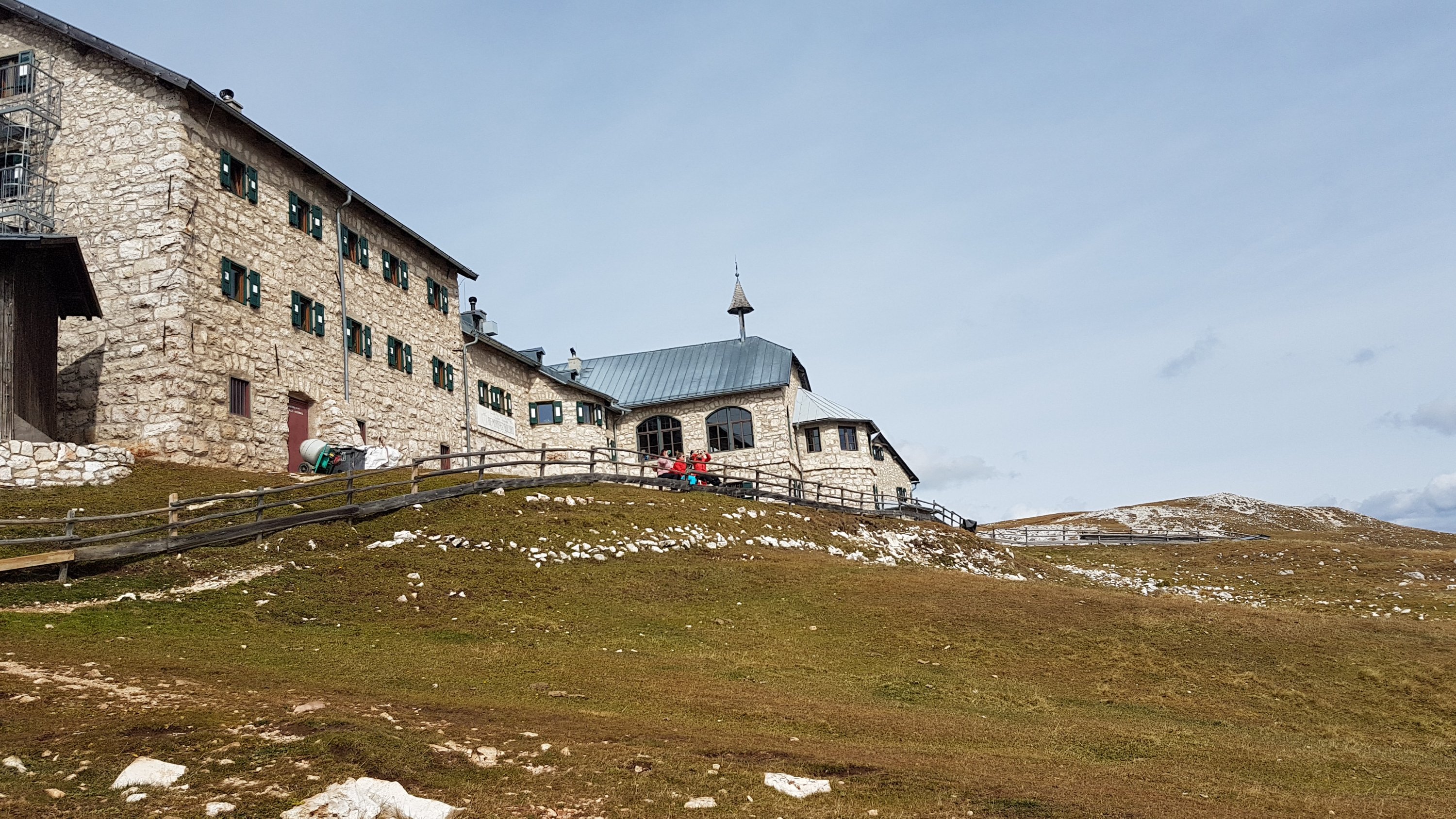 Bald frage ich mich, was wir in den angeschriebenen drei Stunden nach oben so alles machen sollen. Nach etwas mehr als einer Stunde erreichen wir bereits die ersten Almwiesen und damit schon die Hochfläche vom Schlern. Die Beine danken, dass es nur leicht ansteigend weiter geht. Wir spazieren hier oben entlang und genießen den jede Minute weiter werdenden Rundblick. Bald rutschen auch die Schlernhäuser ins Bild und wir freuen uns auf die Einkehr. Es ist durchaus einiges los hier oben, aber es gibt ja auch unzählige Möglichkeiten hier hoch zu kommen. Allen gemeinsam ist, dass jeder mindesten 700 hm zu Fuß überwinden muss. Es gibt ja keinen direkten Seilbahnanschluss.