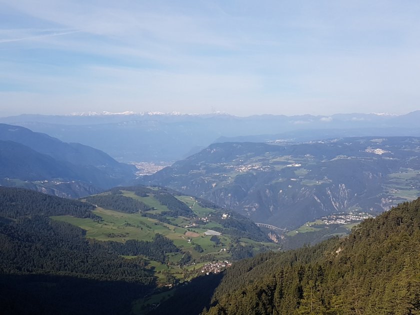 Der Start ist genau nach meinem Geschmack – erst einmal sanft ansteigend auf Waldwegen zum warm und wach werden. Ich Frage mich, ob wir den Spaß hier durchstehen. Es ist fast wie Zugspitze, nur fährt hier keine Seilbahn runter. Egal, umkehren geht immer und wir sind auch nicht völlig untrainiert. Nach 30 Minuten erreichen wir die Tuffalm, den ersten Wegpunkt und wir liegen gut in der Zeit. Von hier aus laufen wir etwas mehr als eine Stunde auf wirklich schönen Waldwegen und -steigen, ehe der Schäufelesteig abzweigt. Wir können immer wieder Bozen sehen und am Horizont den schneebedeckten Ortler und den Alpenhauptkamm.