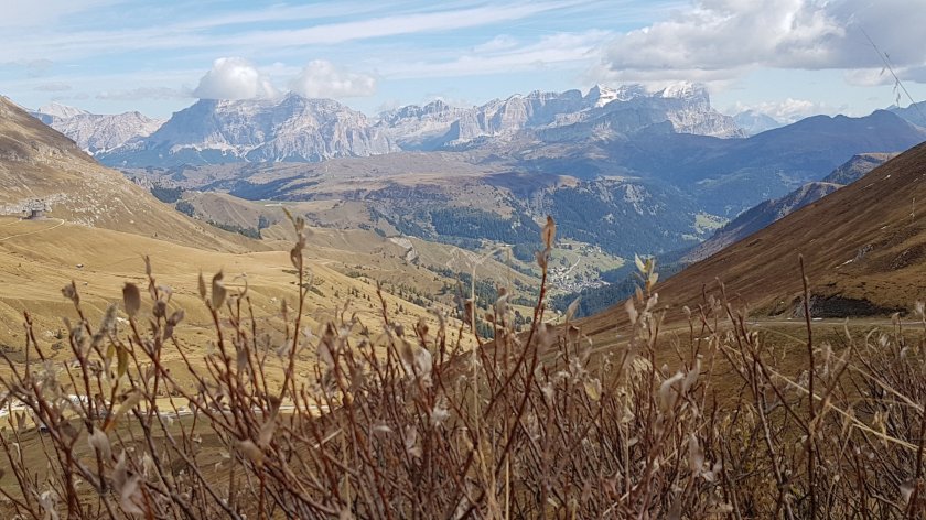 Wir wollen heute unsere Beinen eine kleine Pause gönnen und trotzdem etwas unterwegs sein. Dafür bietet sich ein Panoramaweg geradezu an. Der Weg dahin ist schon randvoll mit wunderbaren Aussichten. Wir fahren zum Sellajoch und von dort in vielen Kurven hinab in Richtung Canazei um auf halben Weg in Richtung Passo Pordoi wieder hoch zu fahren. Ist nicht so ganz meins, aber auch ich muss mal ein Opfer bringen 😉