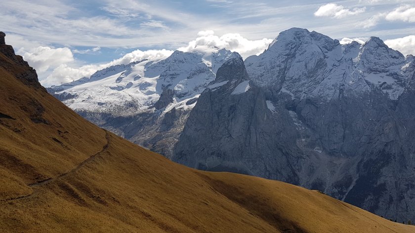 Wir laufen bis zum Rifugio Viel de Pan und können von dort den Lago so Fedaia in der Sonne glitzern sehen. Da alle Hütten geschlossen sind und wir auch nicht bis zum Stausee absteigen wollen – die 450 hm müssten wir ja wieder hoch – kehren wir hier um.