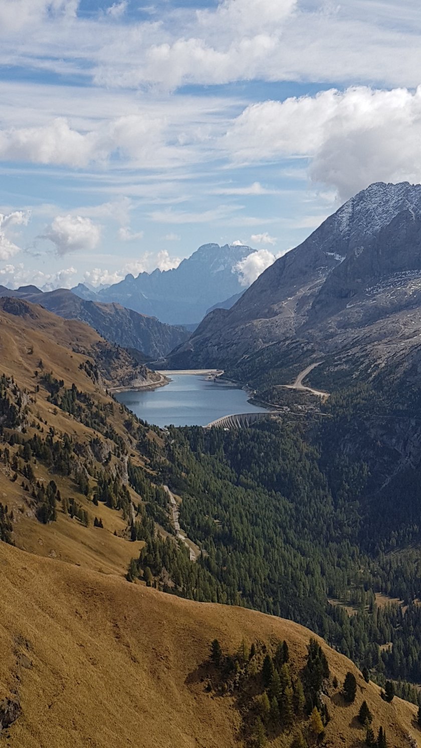 Wir wollen heute unsere Beinen eine kleine Pause gönnen und trotzdem etwas unterwegs sein. Dafür bietet sich ein Panoramaweg geradezu an. Der Weg dahin ist schon randvoll mit wunderbaren Aussichten. Wir fahren zum Sellajoch und von dort in vielen Kurven hinab in Richtung Canazei um auf halben Weg in Richtung Passo Pordoi wieder hoch zu fahren. Ist nicht so ganz meins, aber auch ich muss mal ein Opfer bringen 😉