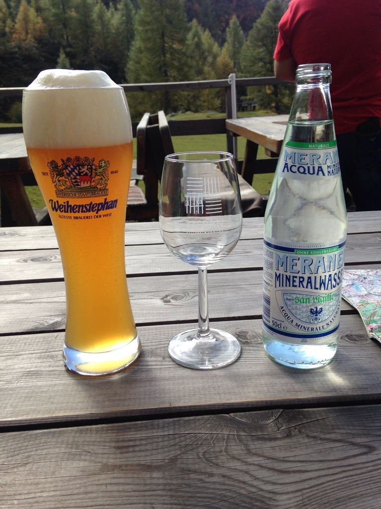 Der Aufstieg zur Taseralm ist nach knapp 90 Minuten geschafft und jetzt – Ifingerhütte, doch Lauwandspitze oder Höfehopping inkl. Abstieg. Wir wählen die Ifingerhütte, die wir nach einer Stunde auf herrlichen Waldwegen/-steigen erreichen. Hier ist richtig viel los. Ich tendiere zum Abstieg. Es wird jedoch just in diesem Moment etwas frei. In der Sonne direkt an der Wand sitzt es sich gut. Weißbier und eine Brettljause sind bestellt.