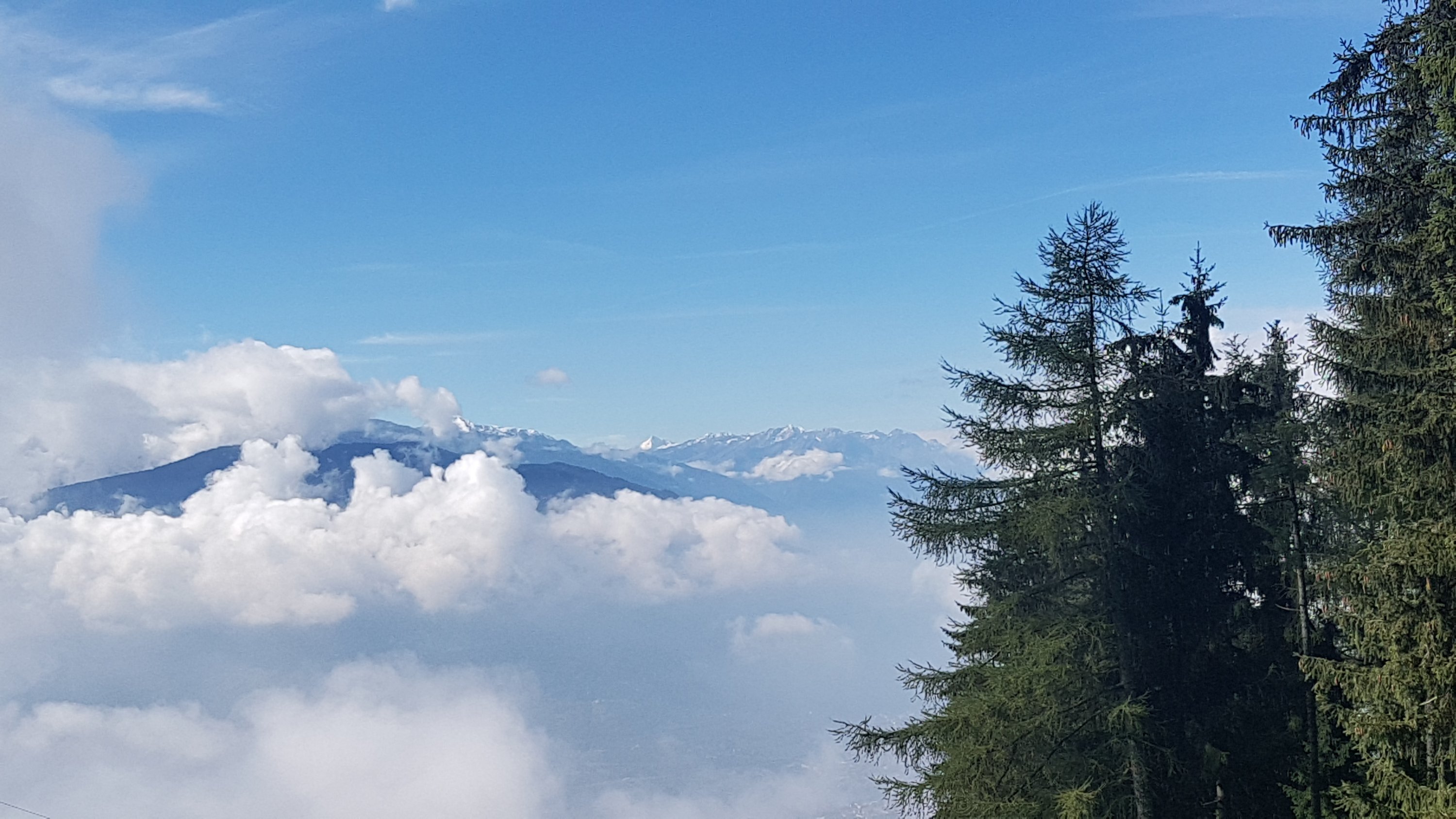 Im Wald oder über steile Wiesenhänge geht es bergauf. Es ist T-Shirtwetter und die sich schnell bewegenden Wolken geben ständig neue Ausblicke frei – mal bis zum Ortler, mal nur wenige Kilometer weit bis Dorf Tirol.