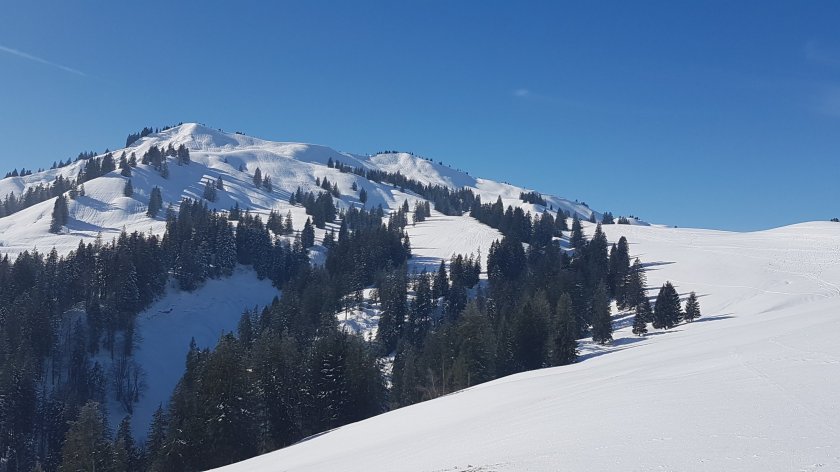 Von der Alpe geht es steil abwärts durch frischen, ungespurten Pulverschee, ehe wir in eine Art Schneeschuh- und Tourenskiautobahn einmünden, die oben auf einem langen Bergrücken entlang führt. Autobahn bezieht sich nur auf die Spuren, gesehen haben wir auch hier niemanden. Wir laufen mit herrlichster Aussicht den Bergrücken bis zum Ende, jetzt immer den Grünten im Blick. Jetzt gibt es nur noch bergab als Option, also machen wir das. Bald gibt es einen sichtbaren Winterweg, der uns hinunter ins Tal bringt, vor die Haustür der Buhl’s Alpe. Einen Apfelstrudel und Käsekuchen später nehmen wir die letzten Meter in Angriff.