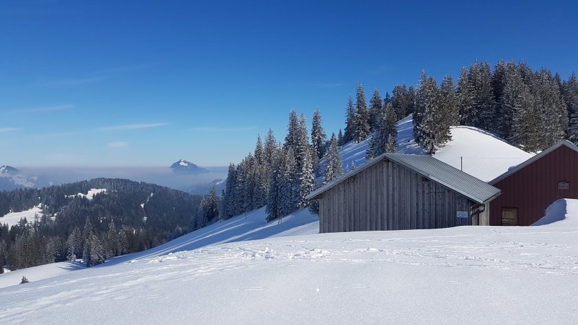 Es wird ziemlich warm und wir entledigen uns der Handschuhe und der obersten Jackenschicht. Ich könnte gerade kurzärmelig gehen. Um den Weg müssen wir uns nicht kümmern, es ist durch Tourengeher perfekt gespurt. Dadurch bleibt einfach mehr Zeit zum genießen. Den höchsten Punkt heute markiert die tief eingedchneite Alpe Höllritzen auf 1.443 m, die einen schönen Rundumbluck bietet. Der einzige Nachteil beim Schneeschuhwandern sind die Pausen: Bänke sind meist unter dem Schnee, die Hütten tief eingeschneit und auf den Wiesen liegt auch genügend von der weißen Pracht. Also findet die Mittagspause im Stehen statt. Geht schneller…
