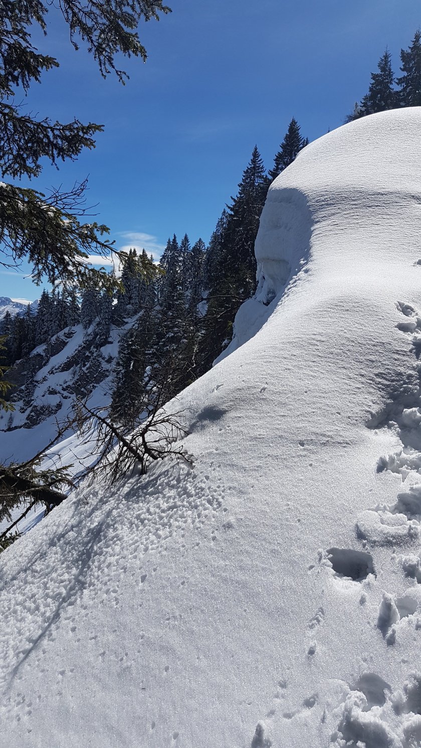 Vor dem eigentluchen Anstieg zum Gipfel verlassen wir den breiten Weg wieder und steigen als erste nach dem Neuschnee am Vortag an einem Hang ganz steil nach oben und verschwinden bald darauf wieder im Wald. Den darf man auch tunlichst nicht verlassen, da die Nordflanke sehr steil abfällt und durch den überhängenden Schnee ziemlich gefährlich ist.