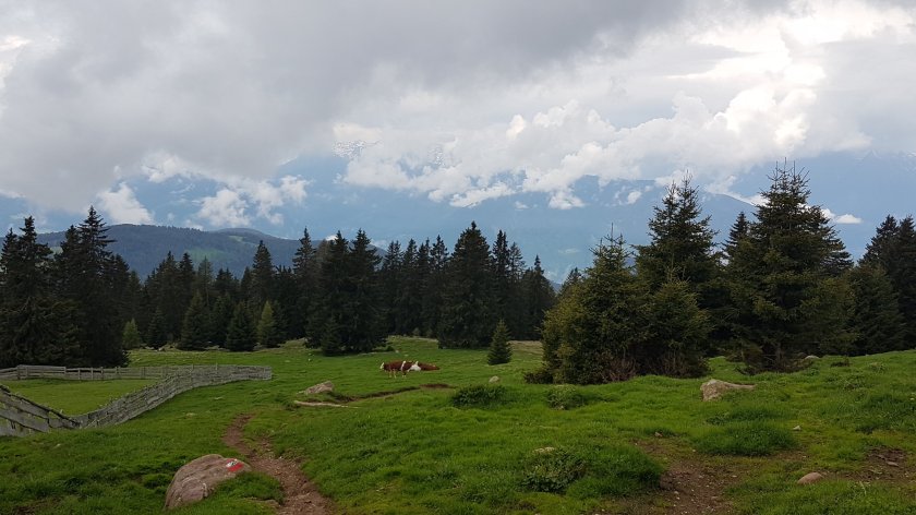 Es schüttet teilweise ordentlich. Als wir nach etwas mehr als einer Stunde an der Leadner Alm ankommen, bricht der Himmel auf und wir machen an einem sonnigen Plätzchen eine kurze Rast. Jetzt ist es nur mehr eine knappe Stunde nach Hafling und es bleibt die ganze Zeit trocken. Kurz vor dem Dorf biegen wir auf den uns schon von gestern bekannten 16er Weg ein, der uns geradewegs zum Hotel bringt.