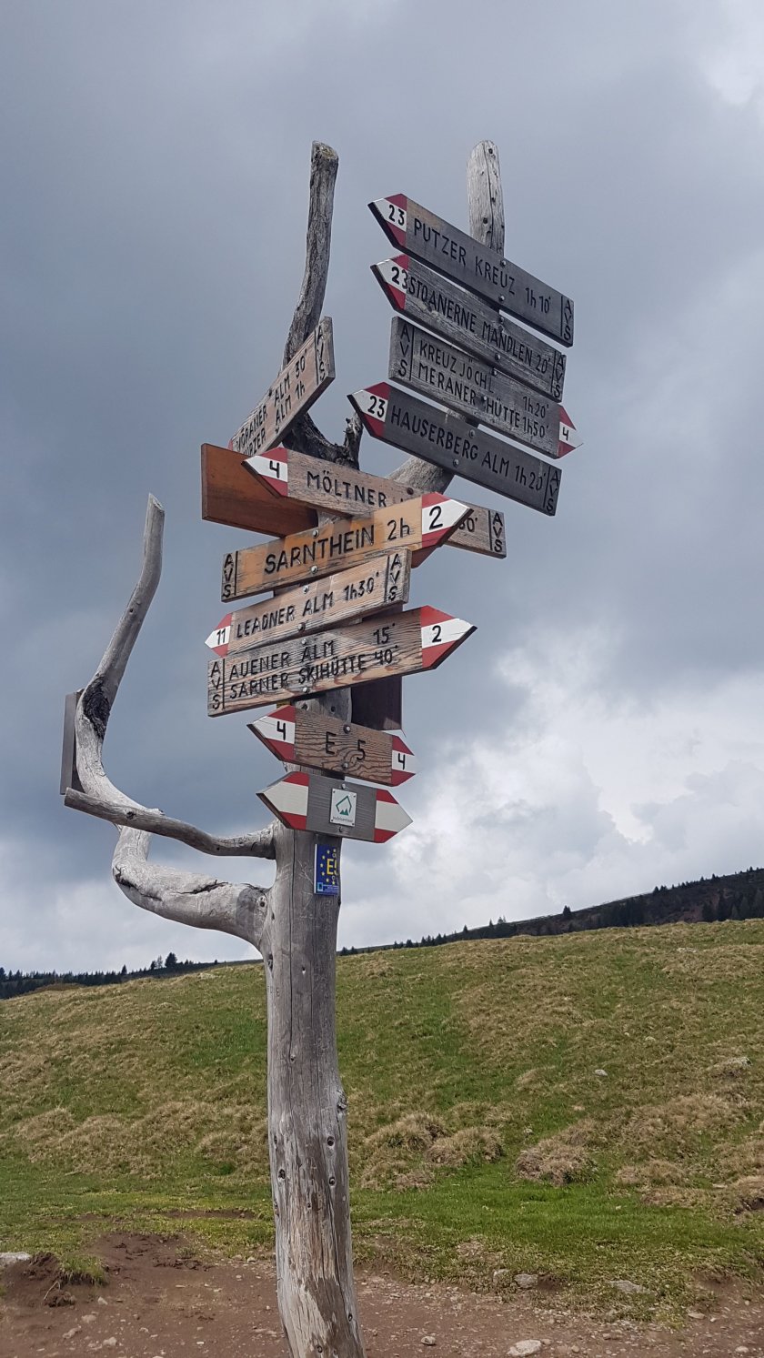 Unser Weg zieht sanft ansteigend weiter, bis wir zu einer echten Kreuzung hier oben kommen. Wir könnten von hier ins Sarntal laufen, hinüber zu Meran2000 oder auch zum Möltener Kaser. Der E5 läuft hier oben auch entlang, aber unser Ziel steht fest – trotz der unzähligen Optionen.