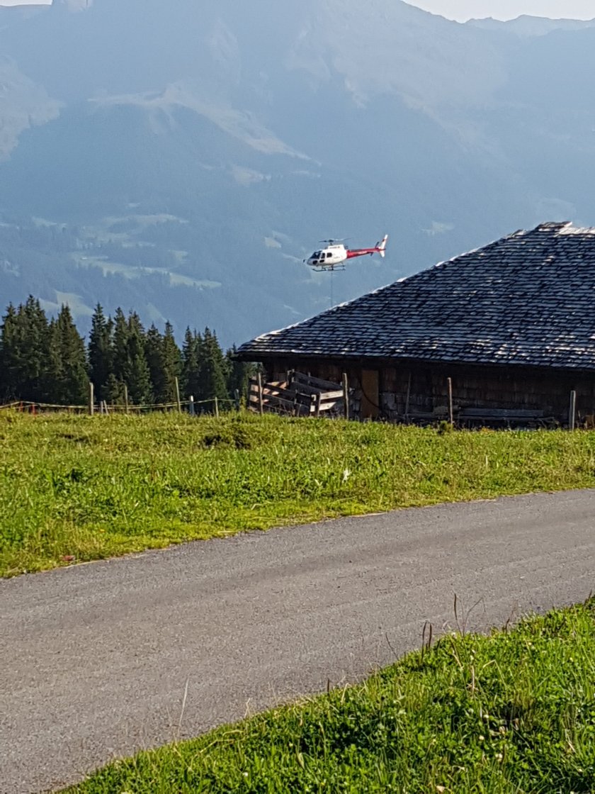 Das Frühstück war mit Ausnahme des frischen Brotes nicht so überragend, aber auch nicht schlecht. Nachdem der Lieblingsmann noch mit 10 Fotoapparaten die Gruppe Franzosen fotografiert hat, kommen wir gegen 8.00 Uhr los. Wir sind allein auf dem schönen, sanft ansteigenden Weg zur Kleinen Scheidegg, dem Zugang und touristischen Hotspot zum Jungfraujoch. Unterwegs beobachten wir, wie ein Hubschrauber eine Baustelle mit Beton versorgt. Spannend zu beobachten.
