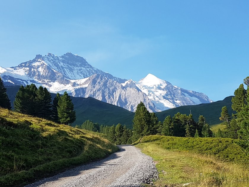 Wir genießen die Aussicht auf Eiger, Mönch und Jungfrau bei einem Cappuccino und sind glücklich, dass das Wetter so perfekt ist. Nicht so sehr zum wandern (schon zu heiß) aber zum fotografieren.