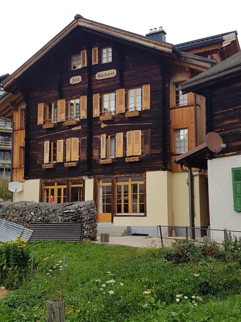Wir bleiben vom Gewitter knapp verschont und kommen ‚trocken‘ in Mürren an. Wir haben auch hier wieder ein Hotel, da nichts anderes für nur eine Nacht zu bekommen war. Aber Hotels sind nicht gleich Hotels. Es ist sehr einfach, mit kleinen Zimmern und Etagendusche. Dafür gibt es im historischen Speisesaal (ja, jetzt regnet es) einen sensationellen Kuchen. Den Namen konnte ich mir leider nicht merken. Er bestand zu großen Teilen aus Schokolade und Nüssen. Das Abendessen ist entsprechend schmal ausgefallen.
