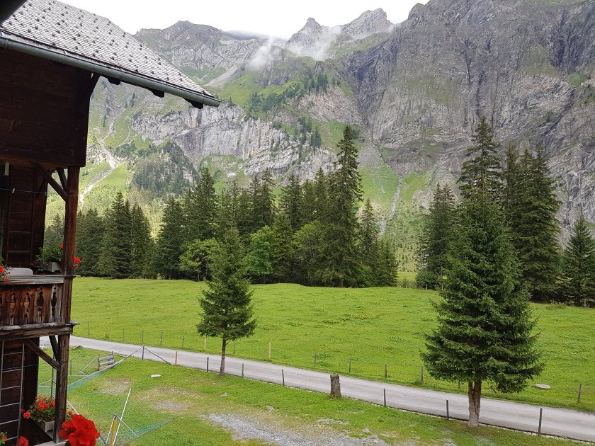 2 Stunden sind oben angeschrieben, wir schaffen es in einer Stunde. Gut so, da wir noch einige Unwägbarkeiten unterwegs haben. Zum Beispiel den Bus zurück von der Talstation der Engstligenalpbahn nach Adelboden. Im Zweifel fährt er uns genau vor der Nase weg und wir müssen eine Stunde warten. Das Glück ist bei uns, wir warten nur 30 Minuten. Der Regen wird immer stärker, die Wolken kleben förmlich am Berg. Theoretisch können die Tour heute machen, ohne einen Schritt zu Fuß zu gehen. Das ist jedoch nicht ganz das, wonach wir suchen… Auch wenn wir gelegentlich schwach werden. Wir ignorieren die Seilbahnen und laufen einen himbeergesäumten Weg bequem bergan. Etwa drei Stunden soll es auf den Hahnenmoospass von Adelboden aus benötigen und wir brauchen auch fast so lange, da wir ständig Beeren futtern. 13.00 Uhr sind wir oben, ein Hatsch inkl. Asphaltstraße mitten ins Skigebiet Adelboden-Lenk. Es ist kalt und windig hier oben auf 2.000 m, so dass wir unser Mittagessen ziemlich schnell verzehren. Der Abstieg nach Lenk hinunter zieht sich sich ewig. Es sind knapp 1.000 hm zu überwinden u d die Wege sind durch den ausgiebigen Regen teilweise ziemlich matschig. Kurz vor 15.00 Uhr kommen wir in Lenk ziemlich direkt am Bahnhof an. Wir checken, wann die Busse zur Iffigenalp fahren, da wir zumindest einen Teil der Strecke von weiteren 2 Stunden und 30 Minuten zur Iffigenalp mit dem Bus fahren werden. Jetzt suchen wir ein Café um unseren besonderen Tag heute mit einem Stück Kuchen zu feiern.