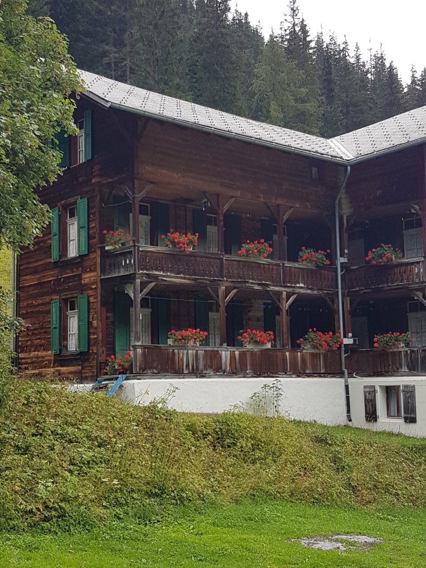 Hier auf der Alp haben wir ganz süße Zimmer, die über den Balkon begangen werden. Der Blick auf die Berge gegenüber ist traumhaft und die Kühe mit ihren Glocken um den Hals weiden direkt vorm Haus.