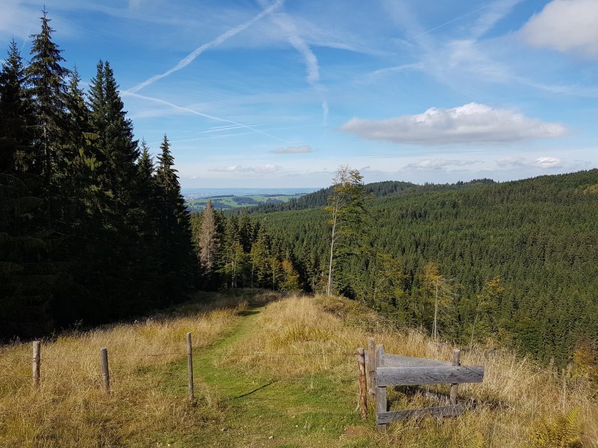 Wir queren den Bach, der uns die meiste Zeit begleitet hatte und ab hier wird aus dem Spaziergang doch noch eine Wanderung. Es geht nämlich jetzt hoch. Irgendwo müssen die 500 hm auch herkommen. Es ist ein gemütlicher Anstieg, der uns nach dem Wald auf einen breiten Wiesenrücken aufwärts führt. Langsam kommt auch etwas Sicht hinzu, für manche eine willkommene Gelegenheit, zu schnaufen und zu schauen. Nach Süden sehen wir aufgrund der geringen nicht so viel. Auch das vor uns liegende Wertacher Hörnle nimmt uns die Sicht. Von Westen grüßt der Grünten und nach Norden öffnet sich der Blick in den flachen Teil des Allgäus.
