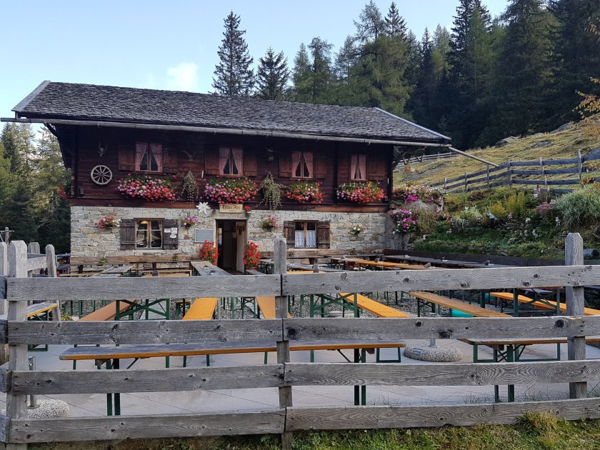 Alternative: Erst einmal noch eine Mütze Schlaf. Ausweichtouren gibt es zum Glück ja hier zuhauf. Nach einem entspannten Start in den Tag fahren wir über das Passeiertal in das Pfelderer Tal und von dort auf nach Ulfas. Nach ewigen Kehren am Hang können wir das Auto an einem Wanderparkplatz auf einer kleinen Hochebene abstellen. Welch Kontrast zur Anfahrt, wo unterwegs jedes Haus förmlich am Hang klebte. Gemütlich starten wir auf einem Forstweg, der uns in 20 Minuten zur Ulfas-Alm bringt. Es sieht gemütlich aus und wir freuen uns schon auf eine Einkehr am Ende der Tour.