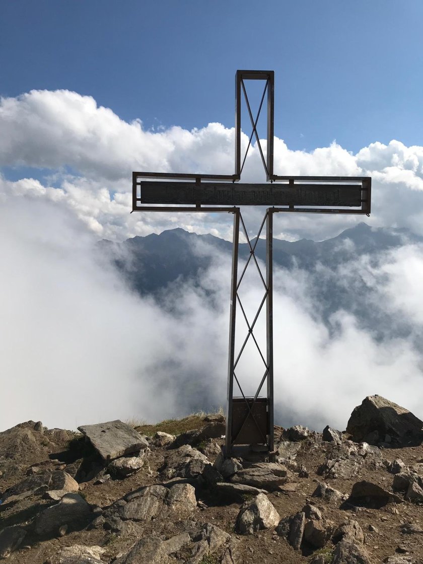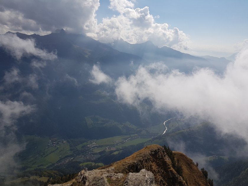 Ab hetzt windet sich ein wunderbar angelegter Steig über Wiesen und durch kleine Lärchenwälder nach oben. Wir schauen nördlich bereits auf die Ötztaler Alpen in Richtung Timmelsjoch. Die immer wieder aufziehenden Wolken schaffen beständig neue Aussichten. Es USt ein herrlich zu laufender Weg, der uns nahezu mühelos zu dem Joch zwischen Hahnl und Matatzspitze bringt. Allerdings werden es immer mehr Wolken und wir laufen wie früher im Disco-Nebel. Egal, die Sicht auf dem Weg ist gut und treppenähnlich steigen wir den Bergrücken zum Gipfel auf. Und heute haben wir Glück: Wenige Sekunden vor dem Gipfel reißen die Wolken auf. Der Blick wird frei ins Passeiertal hinunter, da die Wände hier sehr steil abfallen.