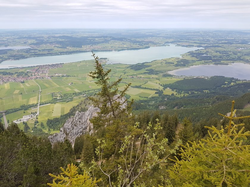 In Schneckengeschwindigkeit und mit parallel durchgeführten Atemübungen kommen wir durch dieses Nadelöhr. Dann ist alles fein. Noch ein paar versprenkelte Besucher, die etwas weiter laufen wollen und dann…. Ruhe. Wir kennen den Weg nur vom Abstieg und sind sehr positiv überrascht, wie gut es sich hier im Wald zum Tegelberg aufsteigen lässt. Genau unser Ding: Meist im Wald, zieht sich der Pfad in Serpentinen gleichmäßig nach oben. Es gibt häufig Blicke auf die vielen Seen, die sich alle vor der ersten Bergkette aufreihen: Forggensee, Hopfensee, Bannwaldsee…