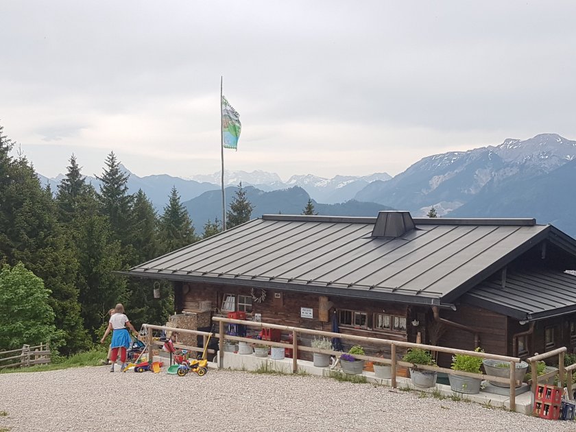 Los geht es durch das beschauliche, aufgräumte Örtchen hinauf zum Waldklettergarten. Das Wetter, die Ferien und Pfingstsonntag sorgen für ordentlich Betrieb, den wir aber schnell hinter uns lassen. Anfangs doch recht steil und mühsam steigen wir auf dem Fahrweg zur Hündleskopfhütte auf. Die ist gut und schnell zu erreichen und so reiht sich auf dem Weg Gruppe an Gruppe.