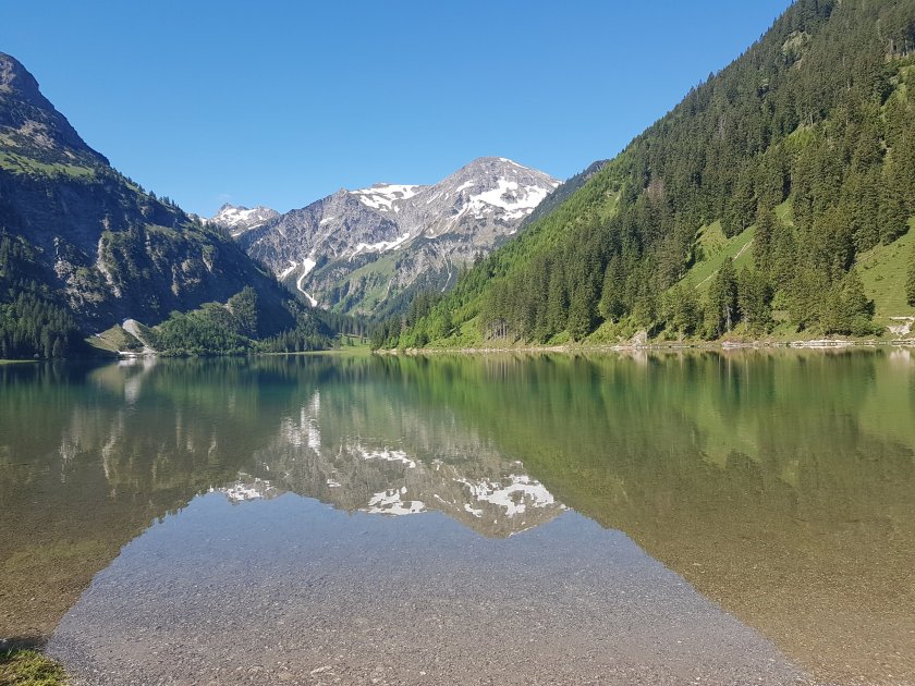Ehe wir dann so aufbruchfertig unser Auto verlassen, ist es 10.00 Uhr und wir sind mit einem ganzen Pulk an Wanderern unterwegs am Ostufer des Vilsalpsees.