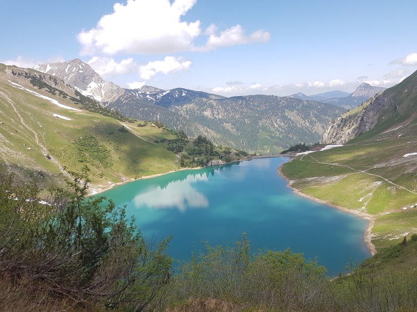 Die werden doch wohl nicht alle dahin wollen, wohin wir unterwegs sind? Doch … es zieht sich jedoch ganz gut auseinander. Anfangs im schattigen Wald geht es im Zickzack immer stetig bergauf. Von unten konnte man die Abbruchkante des Traualpsees schon sehen, so dass wir genau wissen, wo wir rauskommen und was dazwischen liegt. Es sind viele Familien mit Kindern unterwegs, die wirklich tapfer ‚an der Wand hochziehen‘. Am Traualpsee auf etwa 1.600 m machen wir eine kurze Rast für ein zweites Frühstück. Das bietet sich an, da es danach ein ganzes Stück geradeaus am See entlang geht und man mit Essen im Bauch nicht gleich weiter ansteigen muss. Die nächste ‚Stufe‘ zur Landsberger Hütte lässt dennoch nicht lang auf sich warten; die ist jedoch schnell genommen. Die kleine Lacke vor der Hütte ist fast noch ganz zugefroren und hier oben hat es noch einiges an Schnee.