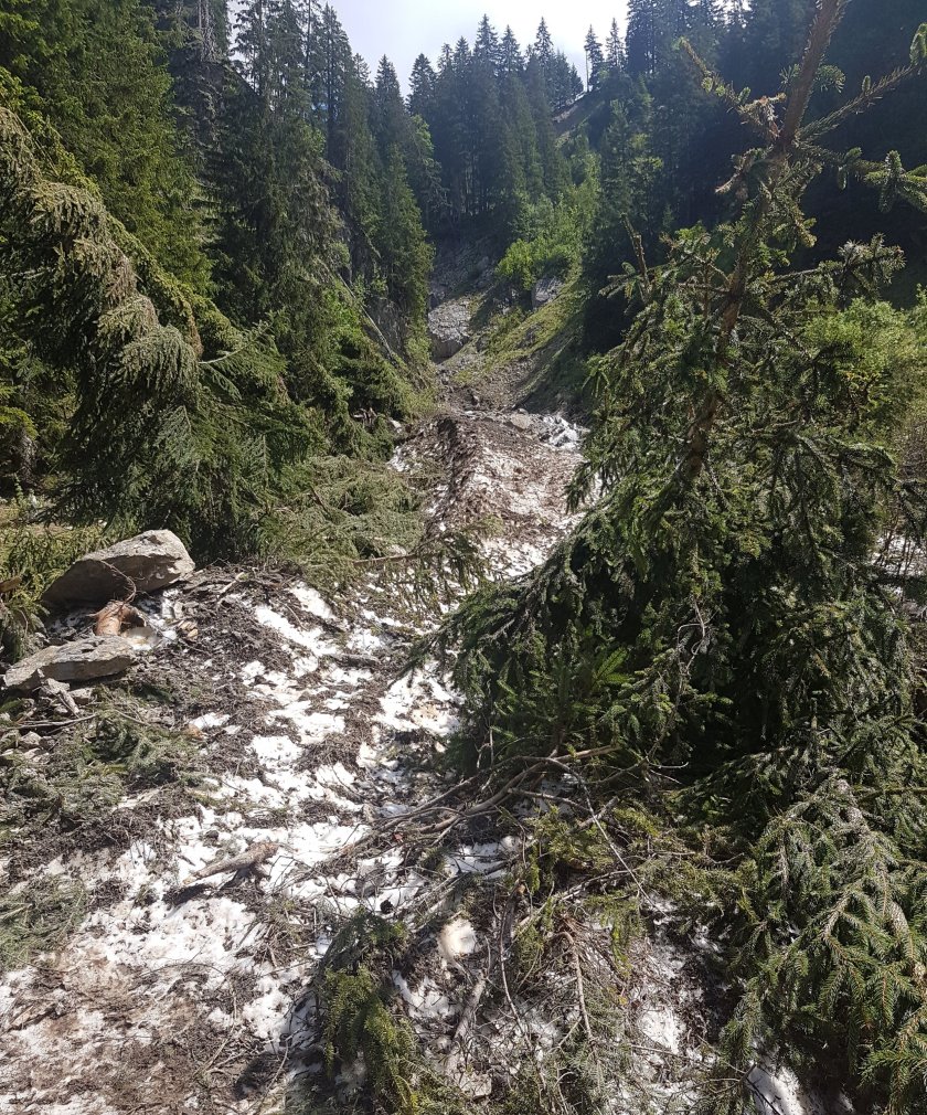 Nach ungefähr der Hälfte des Abstiegs müssen wir einen Bach, der viel Schmelzwasser führt queren – nicht ganz ohne… Am Rand liegen große Schneeberge, die sich hinunter ins Tal ziehen. Das Ganze zieren umgeknickte Bäume – sieht nach ziemlich viel Naturgewalt aus, mit der das Holz mühelos herausgerissen wurde. Wahrscheinlich eine Lawine.