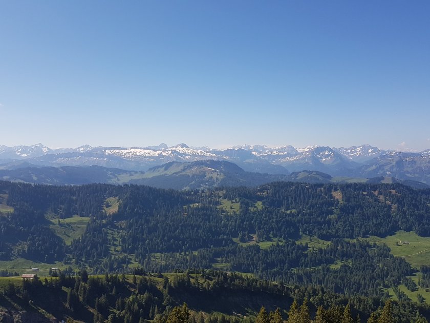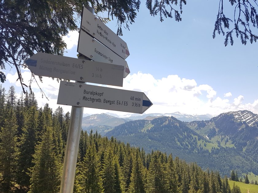 Für Wanderer der Nagelfluhkette gibt es ein Kombiticket für beide Bergbahnen – Hochgrat und Mittag in Immenstadt. In kleinen, postgelben Kabinen, in die nur dann vier Personen passen, wenn alles Kinder sind, zuckle ich in gemächlichstem Tempo auf 1.708 m. Es geht sehr entspannt hier oben zu und es sind auch nicht allzu viele Leute unterwegs. Der Blick beim Heraustreten aus der Bergstation ist trotz des diesigen Wetters überwältigend. Den Bodensee kann ich nur erahnen, dafür kann ich – mit Hilfe meiner peakfinder-App – den Säntis in der Schweiz ausmachen, der Hochvogel präsentiert sich wie gemalt und die Gipfel des Kleinwalsertals mit dem markanten großen Widderstein liegen quasi vor mir.