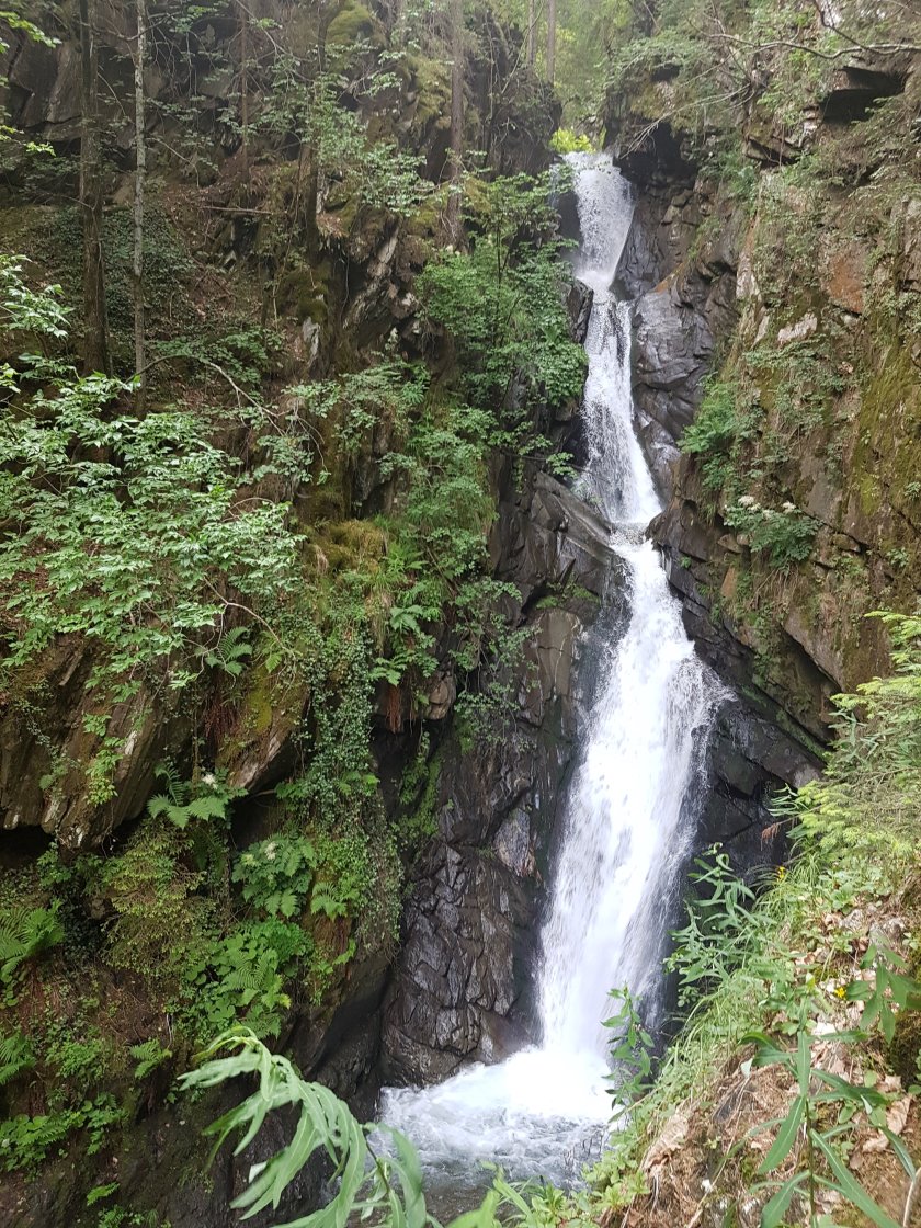 Am Wasserfall ist es etwas kühler, was wir ein paar Minuten genießen. Am Gasthaus Pfeiftal angekommen, ist jetzt Schluß mit flach. Es geht steil bergan – erst durch den Wald und dann bis zum Pfandlerhof auch über Wiesen. Da hält sich kurz vor Mittag der Spaß etwas in Grenzen. Wir widerstehen dem wunderbaren Essensdüften und nehmen die nächste Wiese in Angriff. An deren Ende geht es kurz in den Wald und dann kommt ein Parkplatz – die letzte Parkmöglichkeit hier oben. Es gibt auch den Hinweis zur Pfandleralm, versehen mit einem dicken „Ruhetag“. Die Motivation wackelt kurz. Wir geben uns beide einen Ruck und nehmen trotz geschlossener Alm die verbleibenden 200 hm in Angriff. Außerdem ist dies ein weiteres Stück auf dem Fernwanderweg E5.