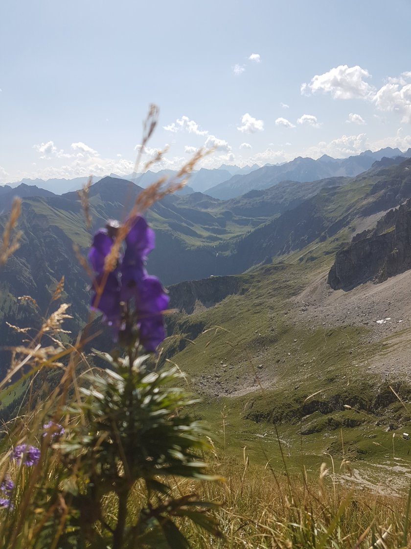 Wir sind bestens ausgestattet und wenig später sind wir schon mitten im steilen Geröllfeld, was einige Kletterpassagen bereithält. Ich wundere mich, dass an keiner Stelle ein Seil angebracht ist. Vielleicht, weil der Weg im Geröll jedes Jahr anders verläuft und ein Seil nichts nützen würde. Es ist eine, durch entgegenkommende Wanderer, lange Phase des Abstiegs und angenehm ist sie auch nicht. Irgendwann jedoch ändert sich der Untergrund und wir laufen über einen – gut in unserer Erinnerung verankerten breiten Bergrücken durch herrlich saftige Wiesen. Der einzige Wermutstropfen ist der kurze Gegenanstieg, den wir noch nehmen müssen. „Es bleibt mir heute nichts erspart“ ist der spontane Ausruf vom Lieblingsmann. Mir kommt spontan, dass es eigentlich eine Tour ist, bei der alles dabei ist – Pfade und schmale Steige, Wald, Wiese, Wege durch Latschenkiefern, Ketterei und Gipfelgenuss, Ausblick und zugleich die Frage, warum man da macht…. wegen alledem.