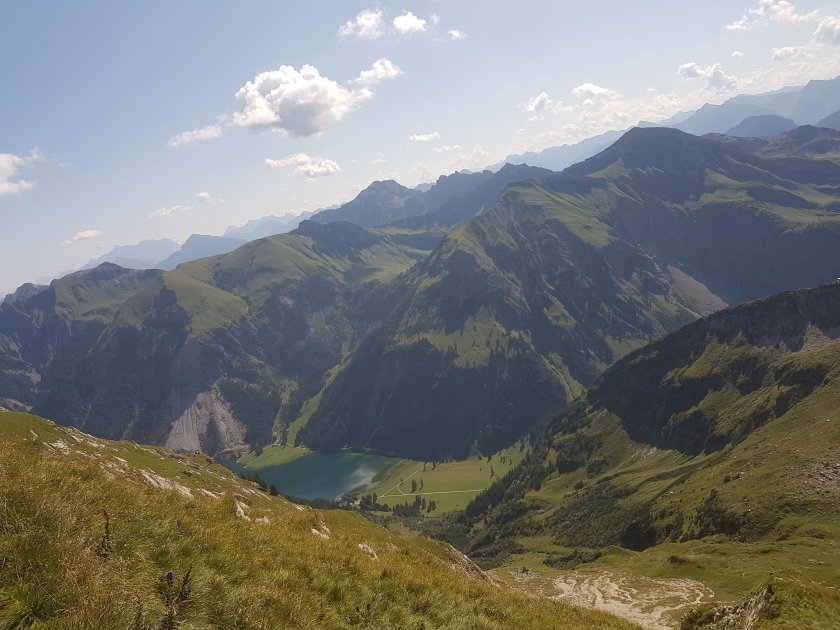 Ab hier geht es auf einem Weg, ähnlich einem Forstweg, abwärts. Für die Hüttenbewirtschaftung beschwerlich genug, für uns – besser für mich – gut zu laufen. Der Lieblingsmannleidet mit jedem Schritt. Ich kann nicht wirklich nicht helfen, wir müssen runter. Ich gebe gelegentlich den Klassenclown, was nur bedingt hilft. 500 um wollen gelaufen sein. Zum Glück ist es meist schattig und wir malen uns die kalte Schorle und das Eis in bunten Farben aus. Als endlich der Vilsalpsee in Sicht kommt, gebe ich vereinbarungsgemäß Gas. Ich mache die Besorgungen und wir treffen uns am Auto. Es gelingt auf die Sekunde und die Schorle verdampft in uns.